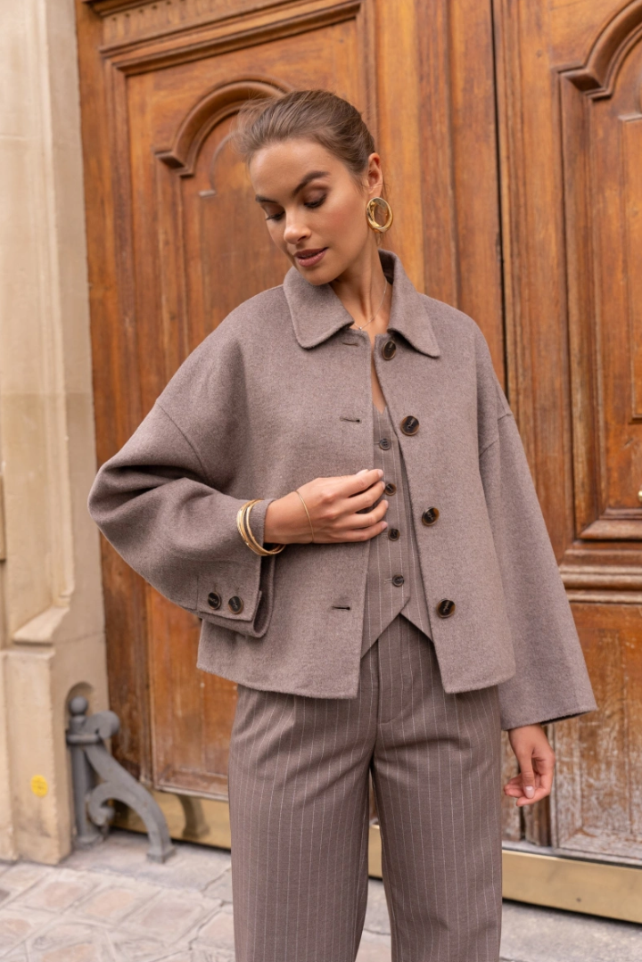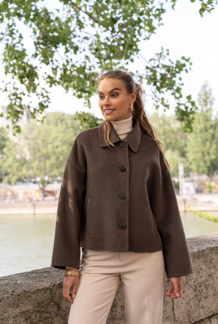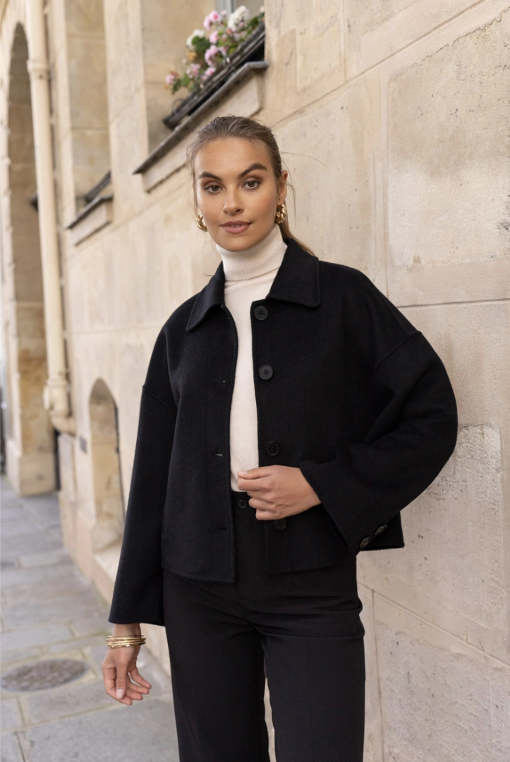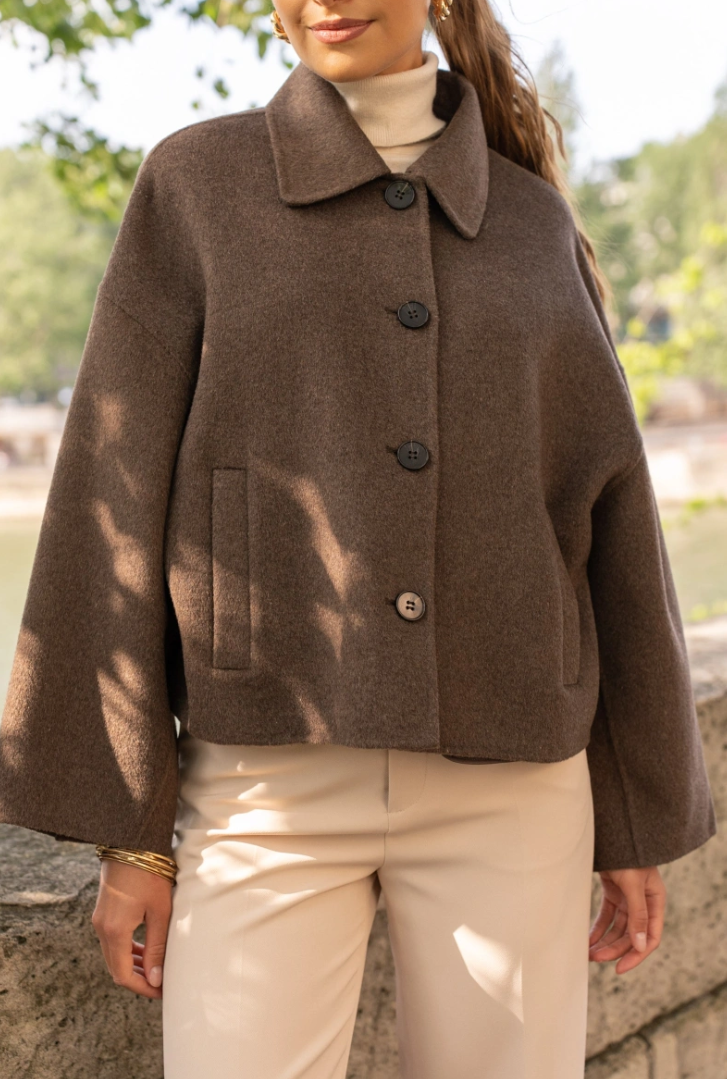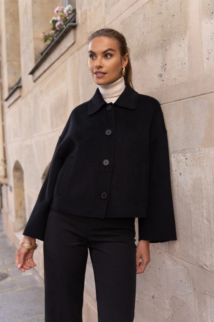 A short, boxy caban with Parisian nonchalance. The classic collar and large buttons create a clean, structured look, while the dropped shoulders and wide sleeves add modern ease of movement. The warm wool-blend fabric drapes lightly yet holds its shape — never heavy, always refined. Perfect over a turtleneck or silk blouse.