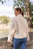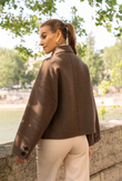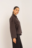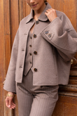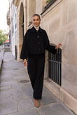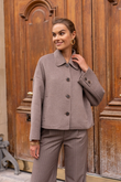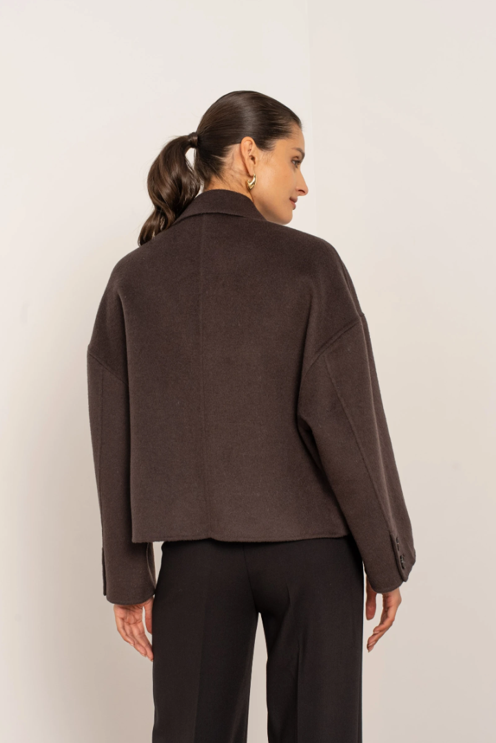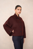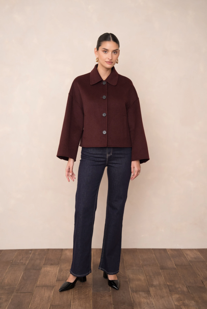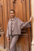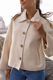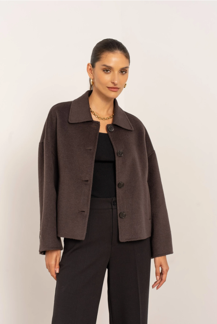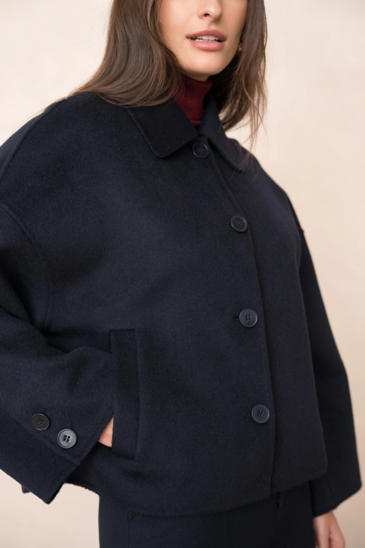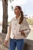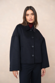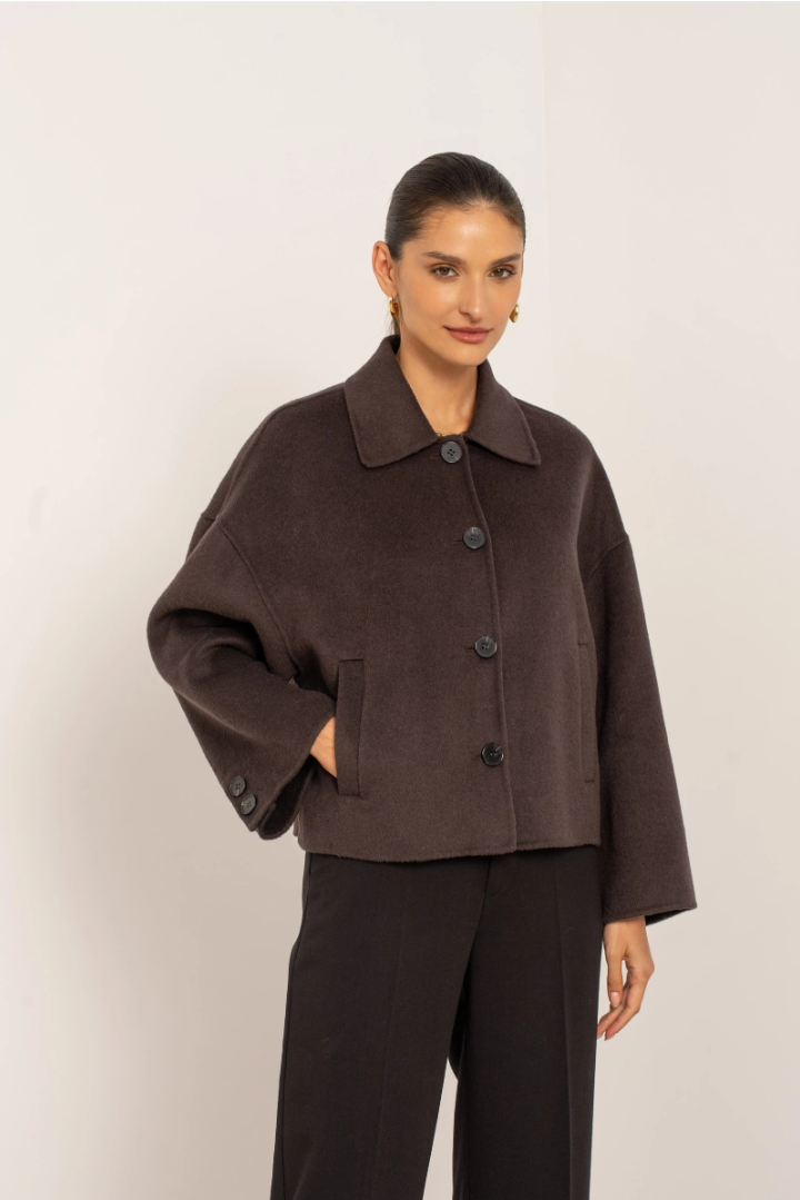 A short, boxy caban with Parisian nonchalance. The classic collar and large buttons create a clean, structured look, while the dropped shoulders and wide sleeves add modern ease of movement. The warm wool-blend fabric drapes lightly yet holds its shape — never heavy, always refined. Perfect over a turtleneck or silk blouse.