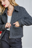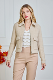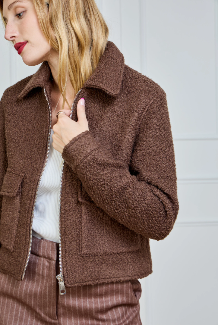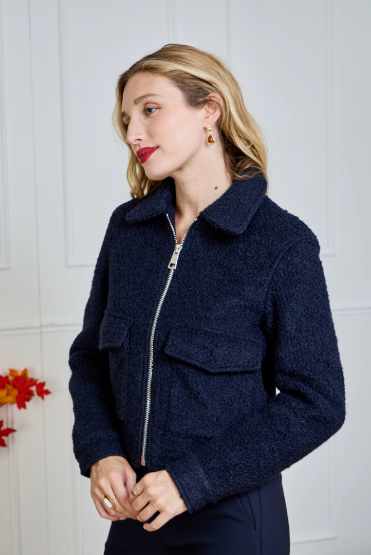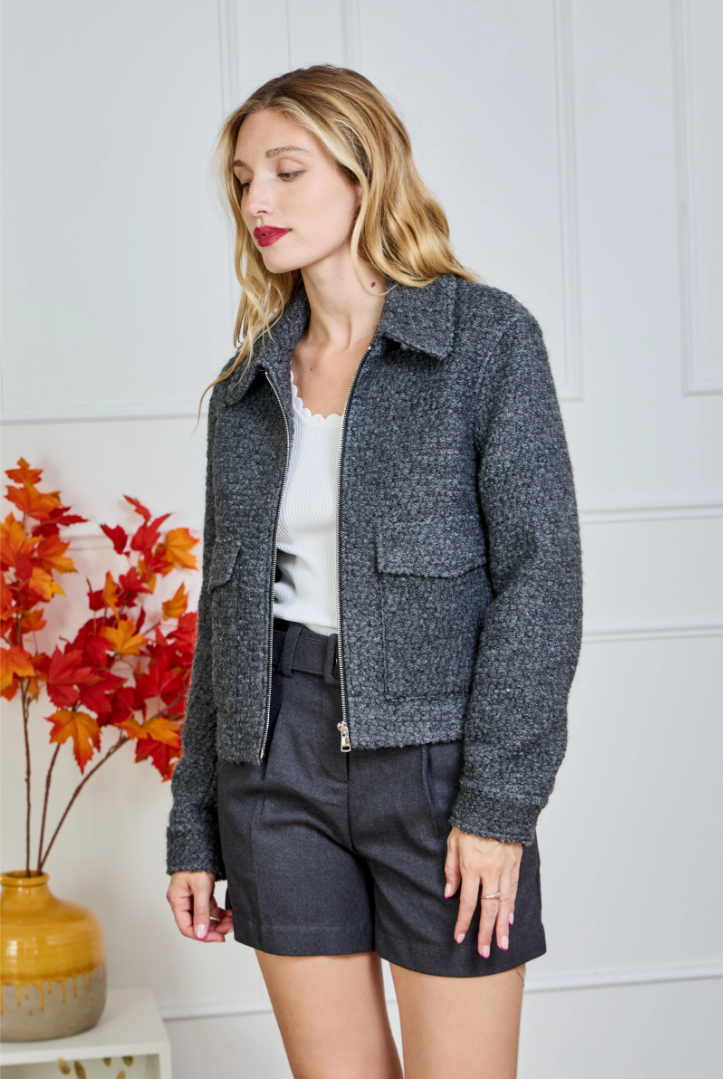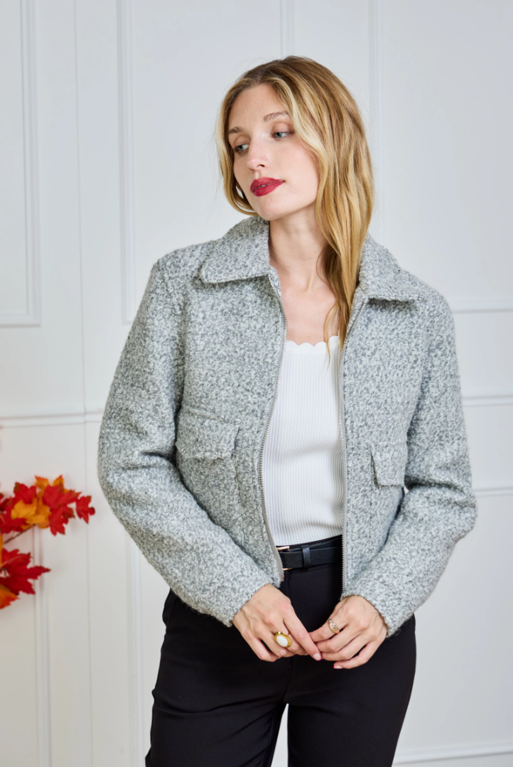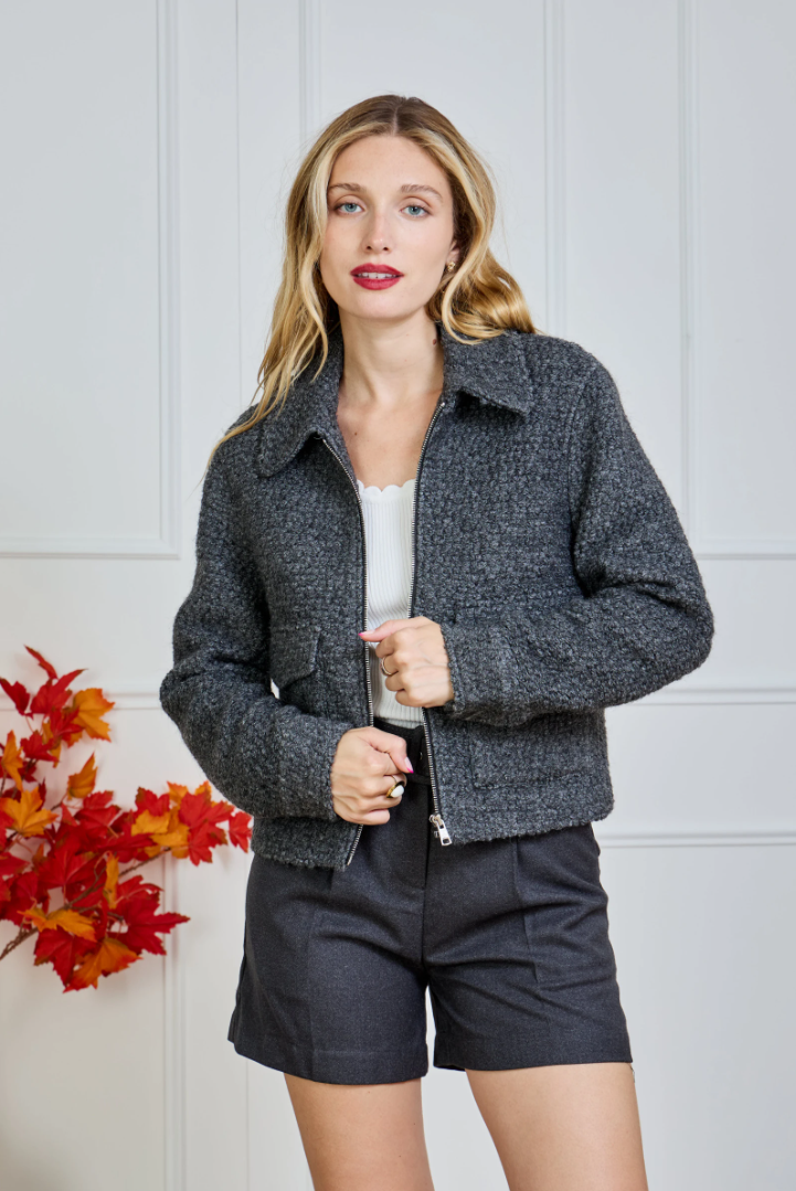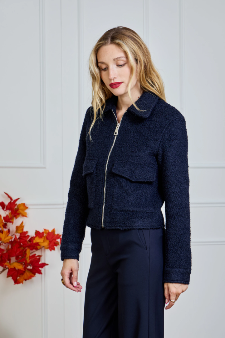A short, straight-cut bouclé jacket with a modern Parisian flair. The rich texture feels soft to the touch and instantly adds structure to any look. Designed with a two-way zipper (opening from both top and bottom), a classic collar, and flap patch pockets for a relaxed yet luxurious finish. Hip length with a lightly boxy fit — perfect over a knit, satin blouse or turtleneck.