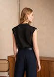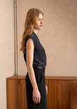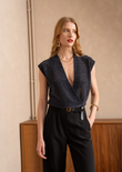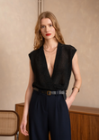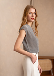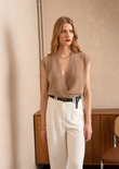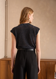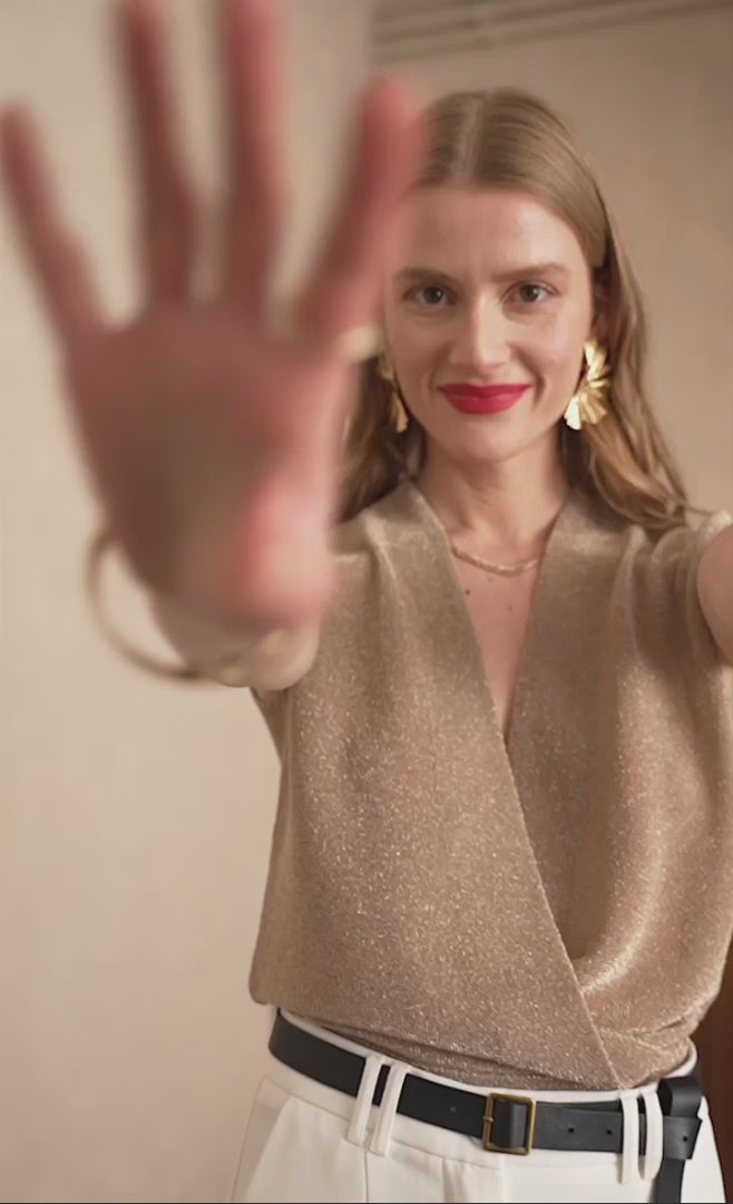 A shimmering sleeveless top with a deep V-wrap front that drapes elegantly along the body. The fine lurex knit adds instant party appeal, while the relaxed fit keeps it easy-chic from day to dinner.