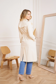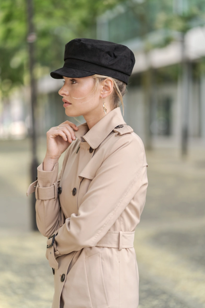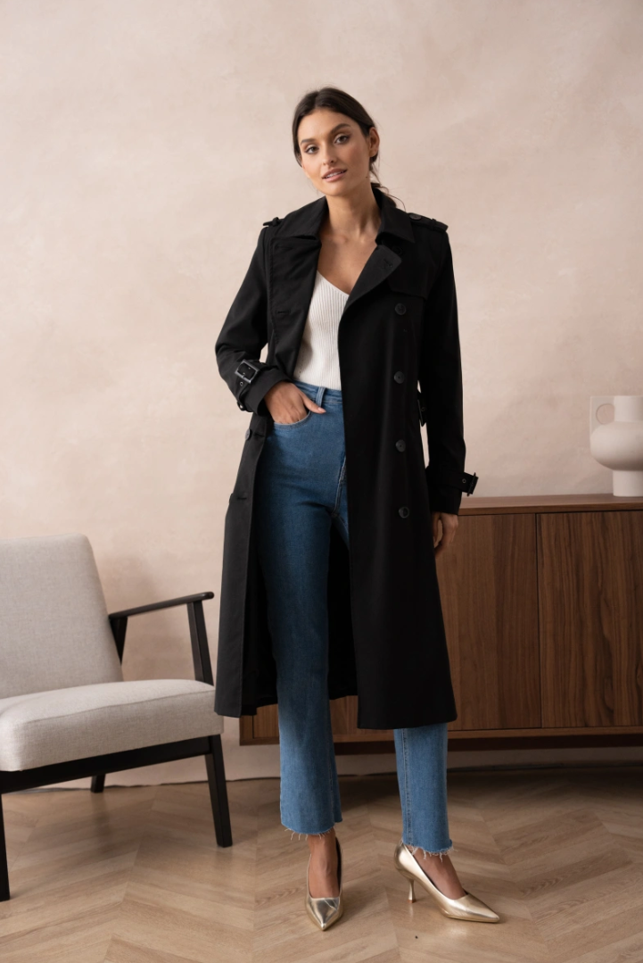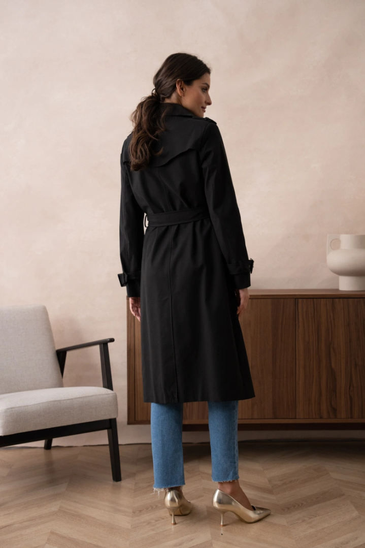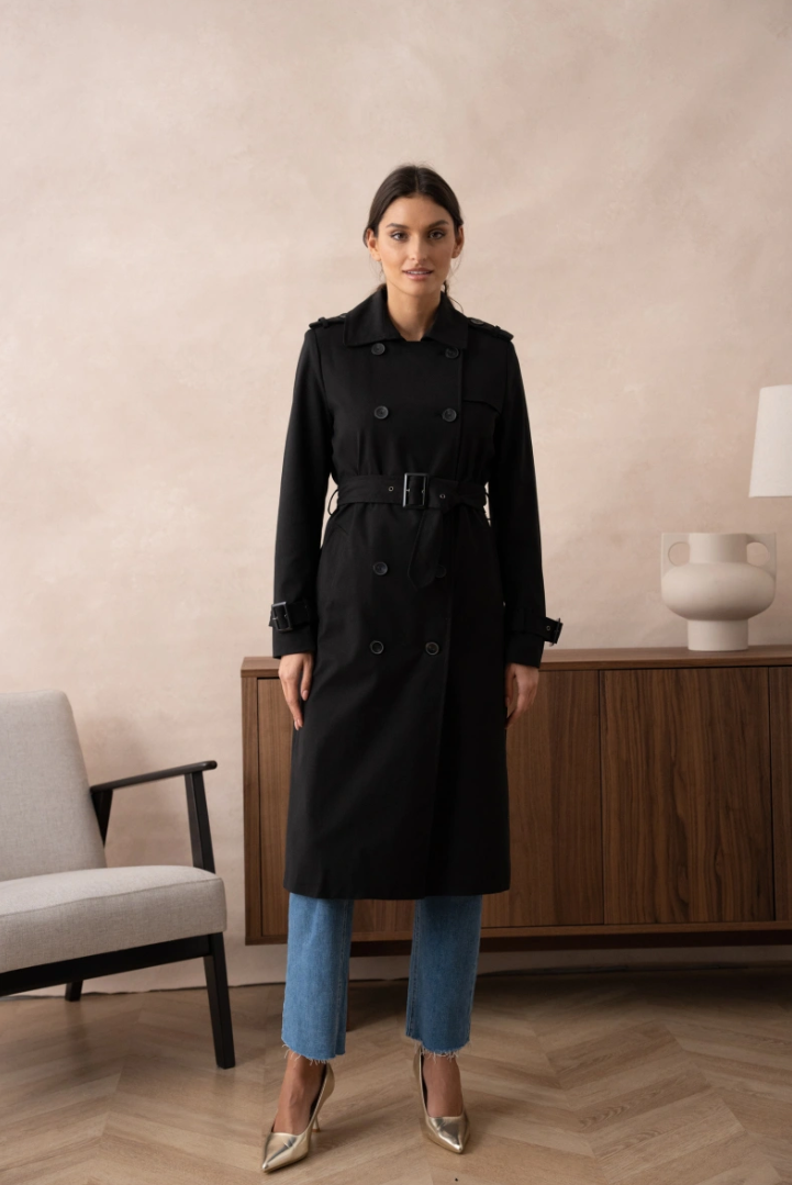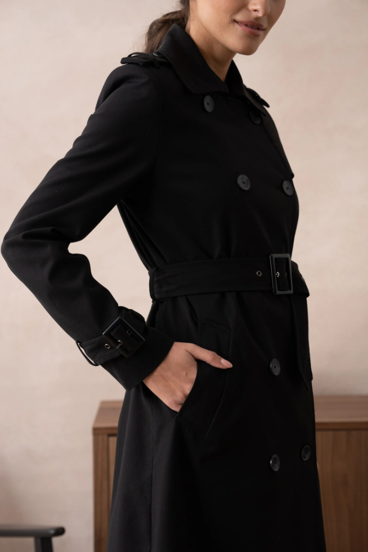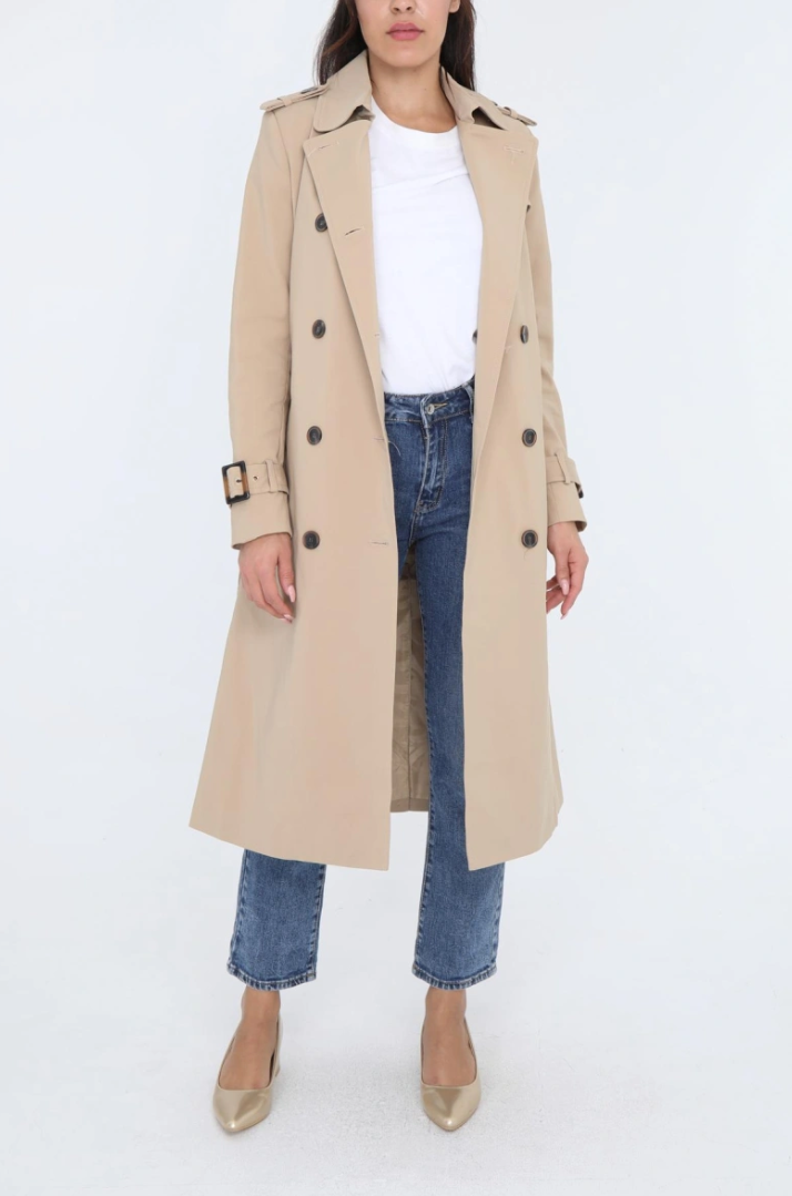An iconic double-breasted trench with a modern Italian cut. The wide lapels, epaulettes and tie-belt with buckle create a sharp, timeless silhouette, while the single back vent and fluid drape ensure ease of movement. The water-repellent gabardine feels sturdy yet lightweight — perfect for changeable weather.