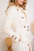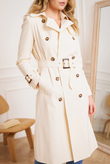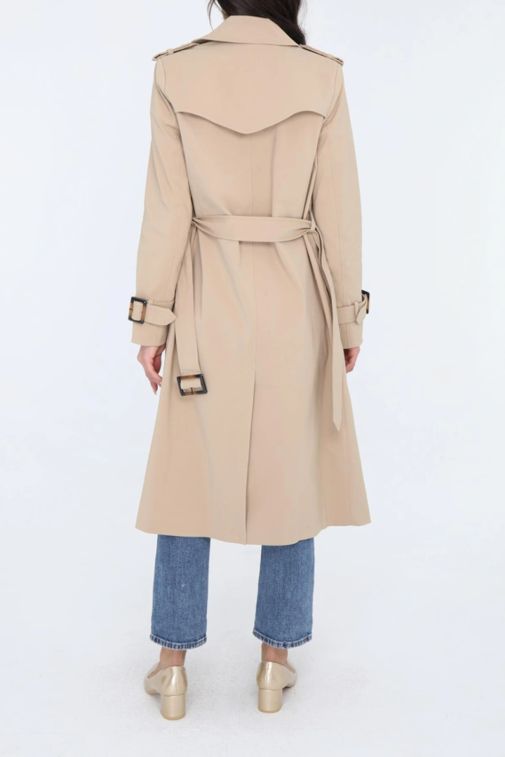 Double-breasted button closure, storm flap, epaulettes, cuff straps with buckles, welt pockets and back vent.
