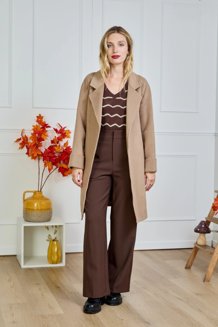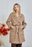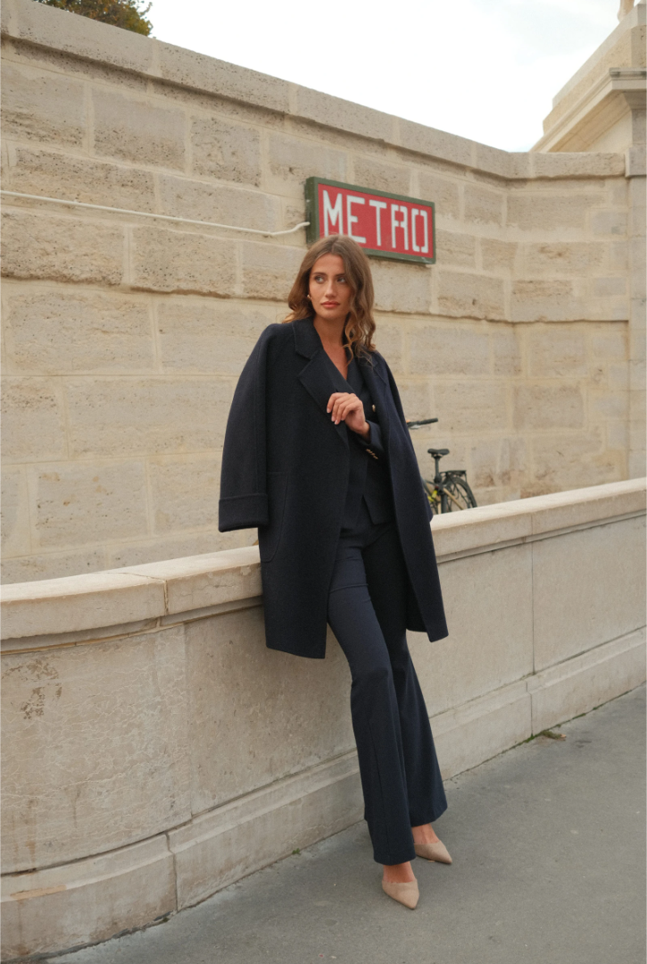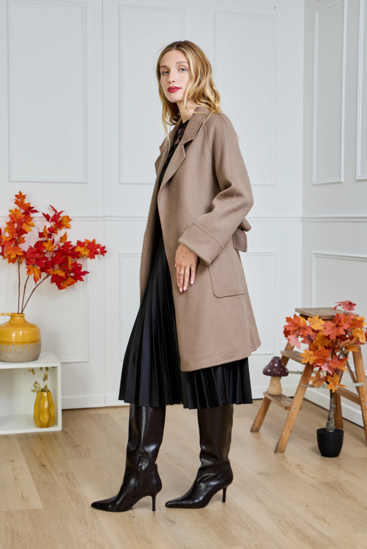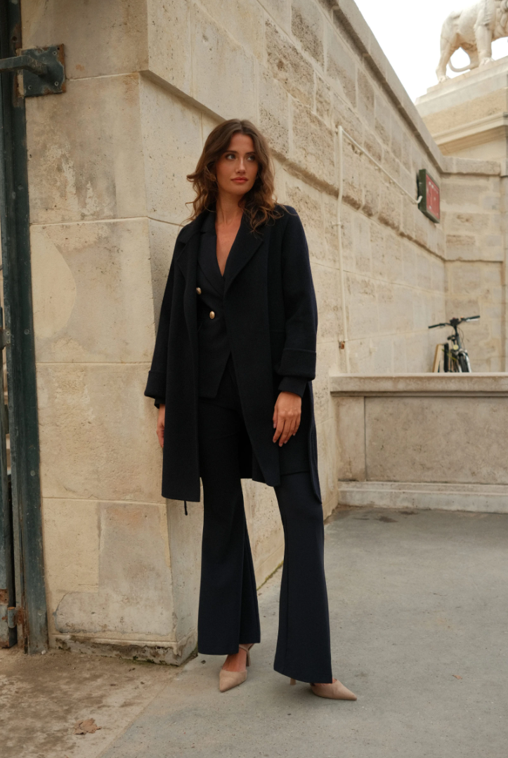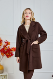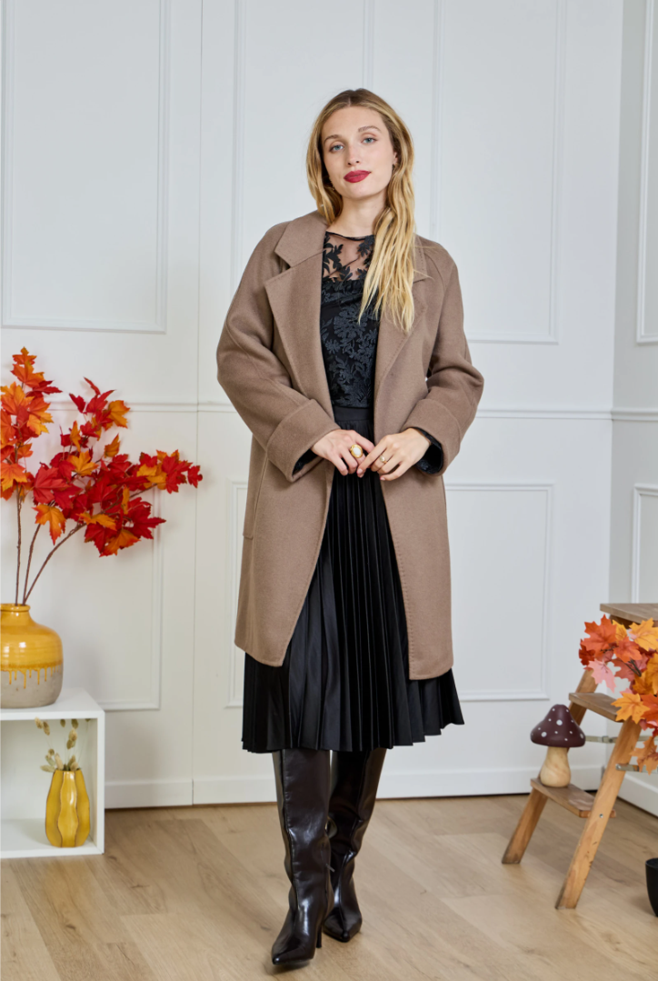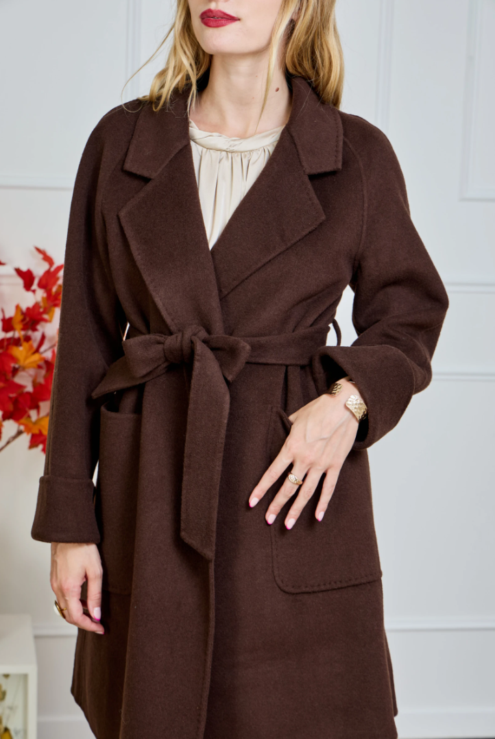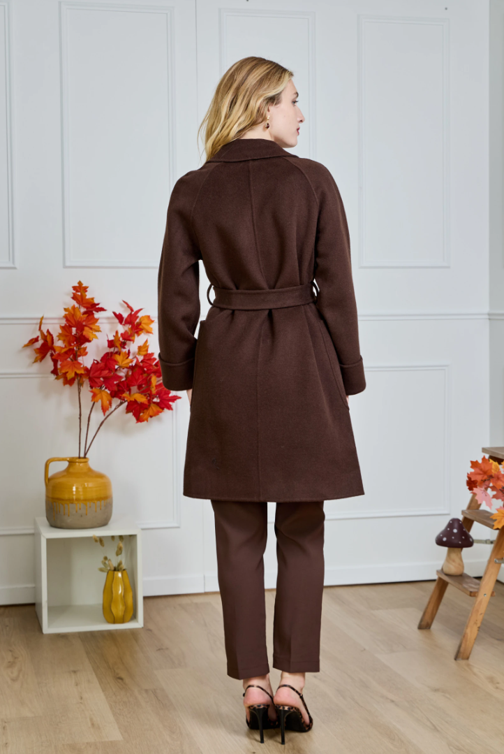 A mid-length wrap coat with a strong Italian presence. The wide lapels, generous turn-up cuffs and belted waist create an elegant, confident silhouette. Crafted from a soft, warm wool blend with a rich, full drape — ideal for sophisticated winter days in the city.