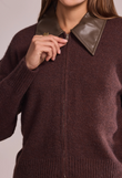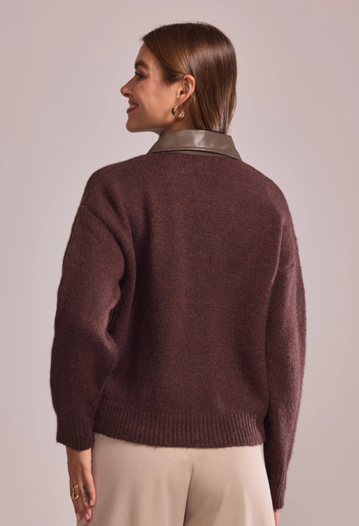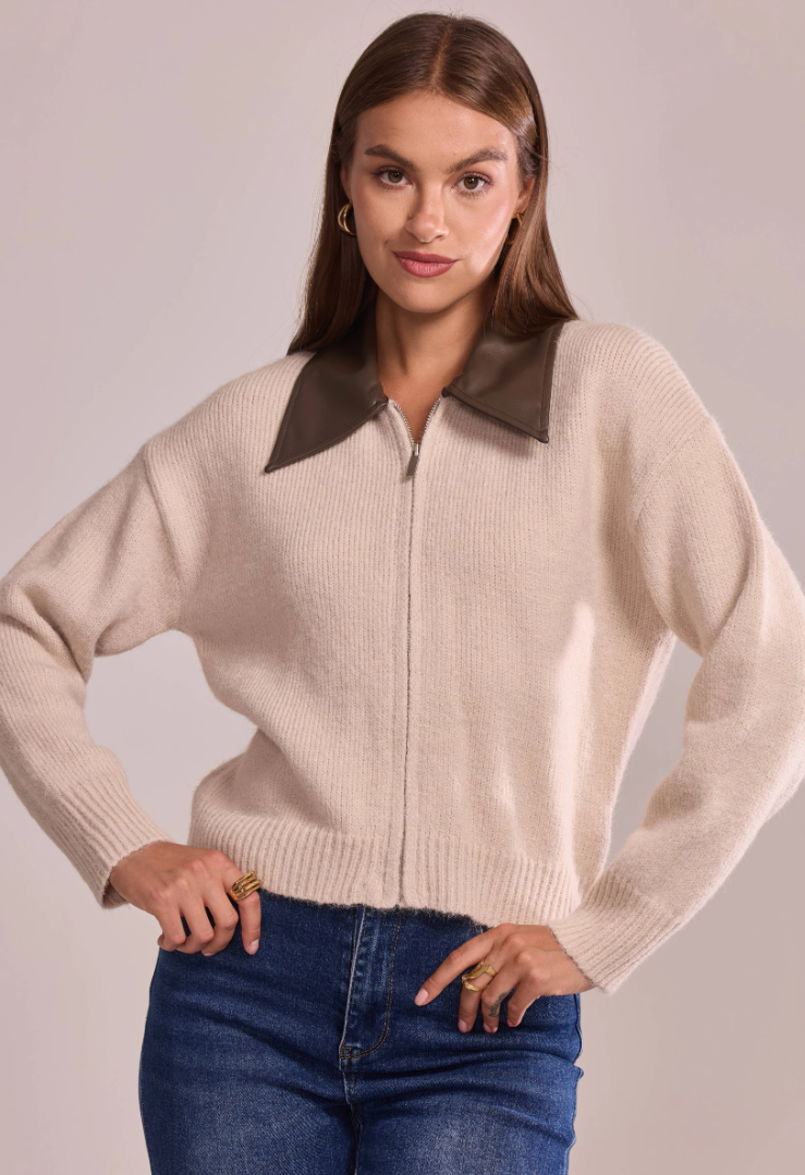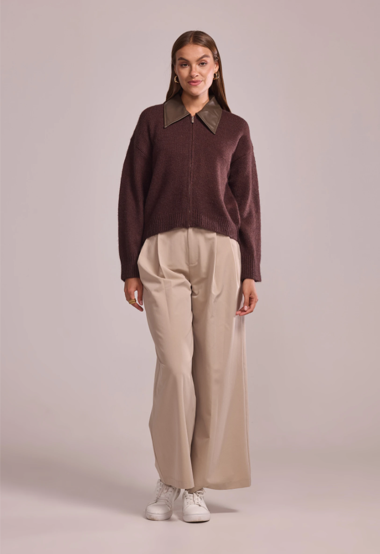 A statement knit that blends softness with sharp lines. This zip-front cardigan features a pointed faux-leather collar — the signature Lancia detail — and a relaxed, slightly cropped silhouette that pairs effortlessly with any look.
