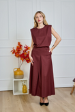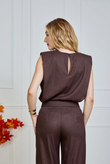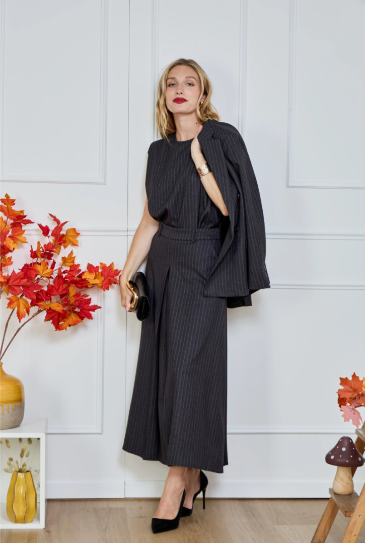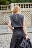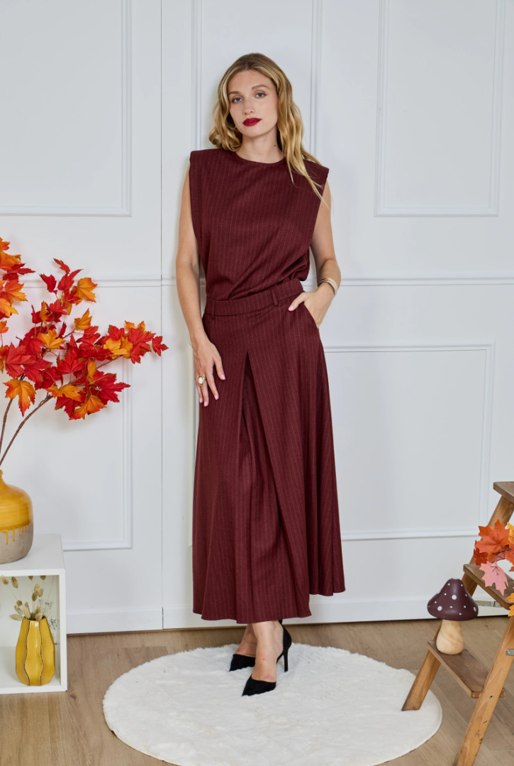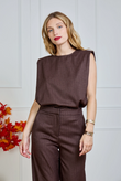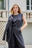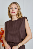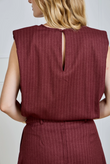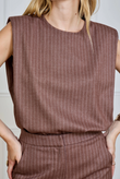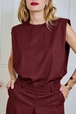 Sleeveless pinstripe top with a straight shoulder line and round neckline, finished at the back with a delicate keyhole button closure. Crafted from supple, shape-retaining suiting with a fine gessato (chalk stripe) and a hint of stretch — elegant, comfortable, and perfectly paired with the Palazzo Gessato Roma Trousers.