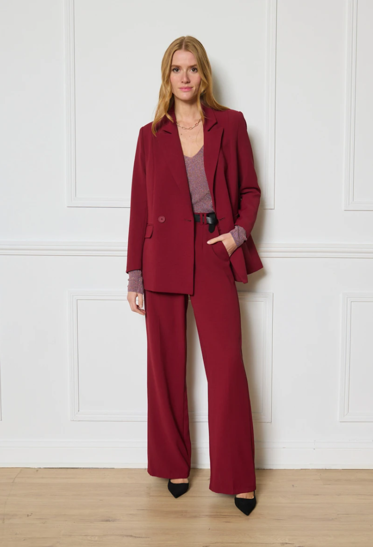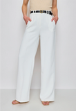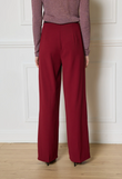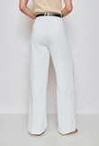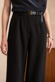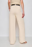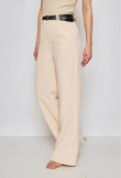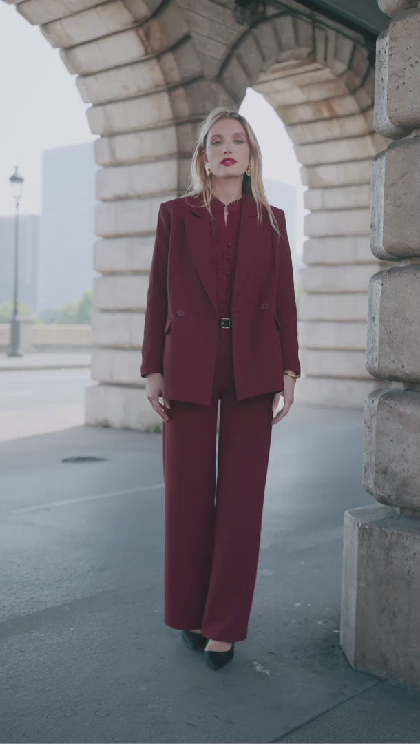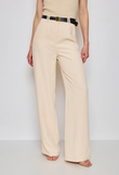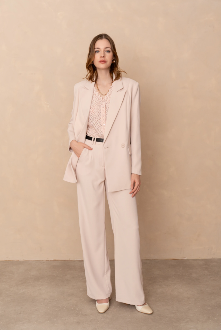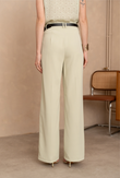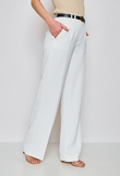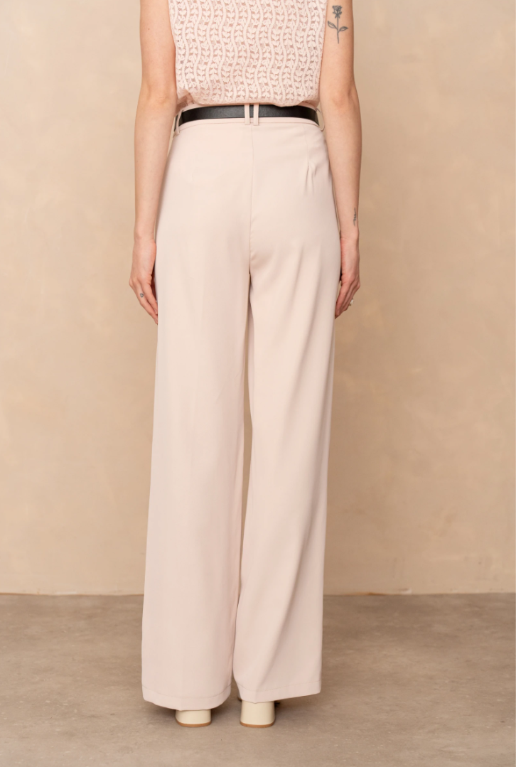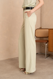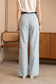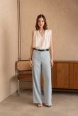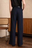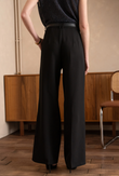 High-waisted palazzo trousers in refined suiting with gentle stretch. Wide, straight leg with a permanent crease; subtle front pleats, slanted side pockets and welt pockets at the back. A clean waistband with hook-and-zip closure and belt loops. Flows effortlessly, keeps its shape — from boardroom to bistro.