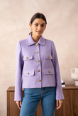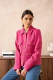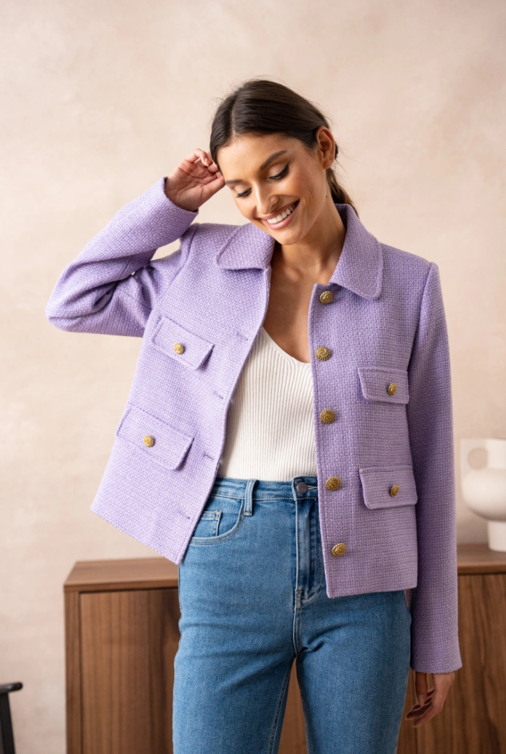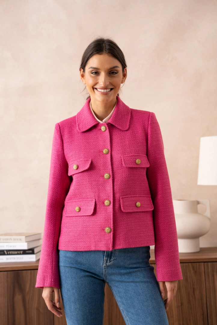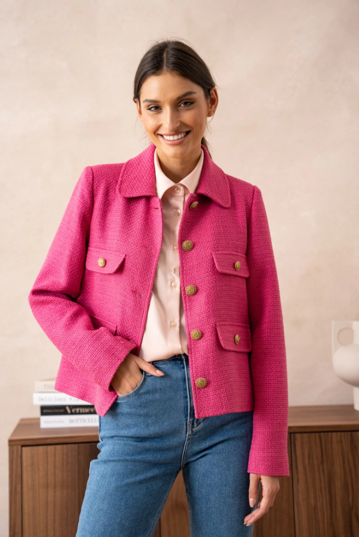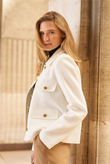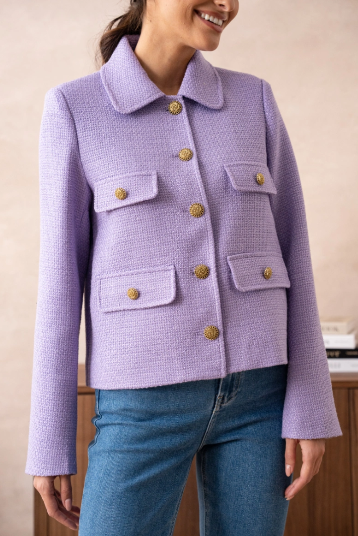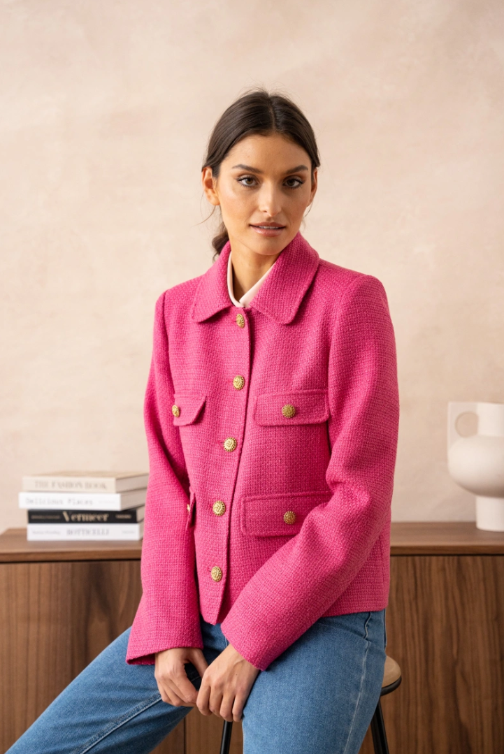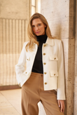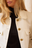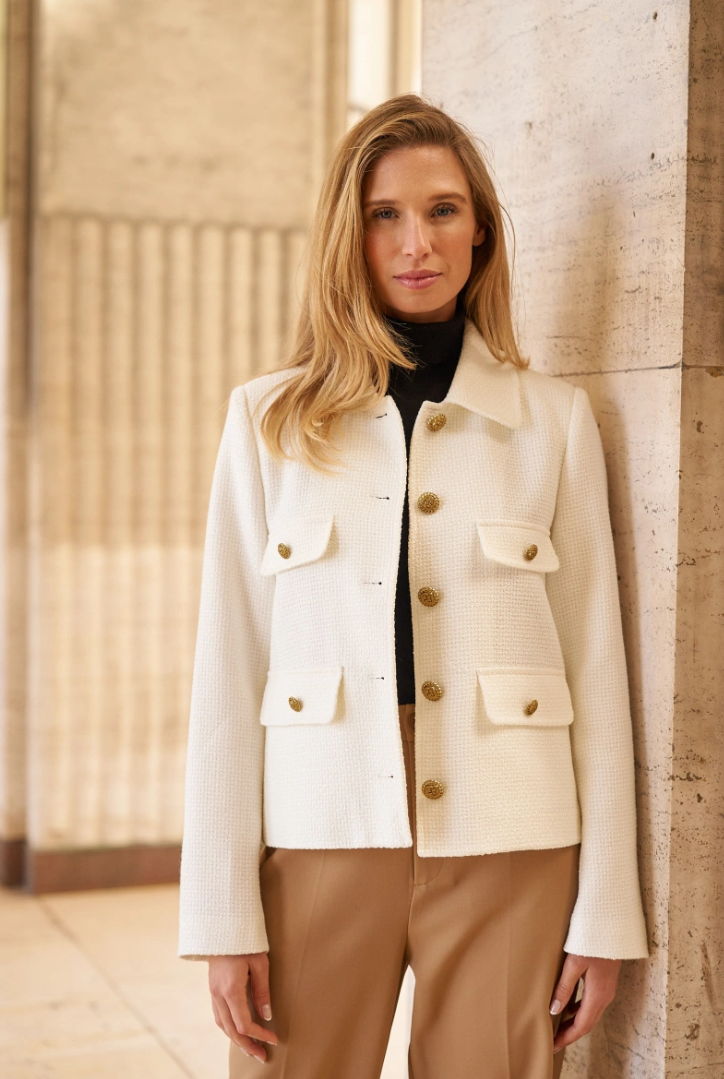 A short, straight jacket in luxurious bouclé — French classicism with a fresh, modern note. The hip-length cut flatters the figure without feeling tight, while four flap pockets and gold-tone buttons give it that instant-chic look that works everywhere — from office to dinner.
