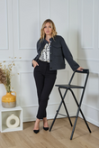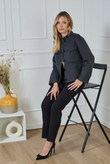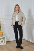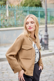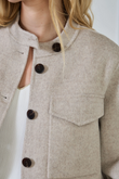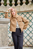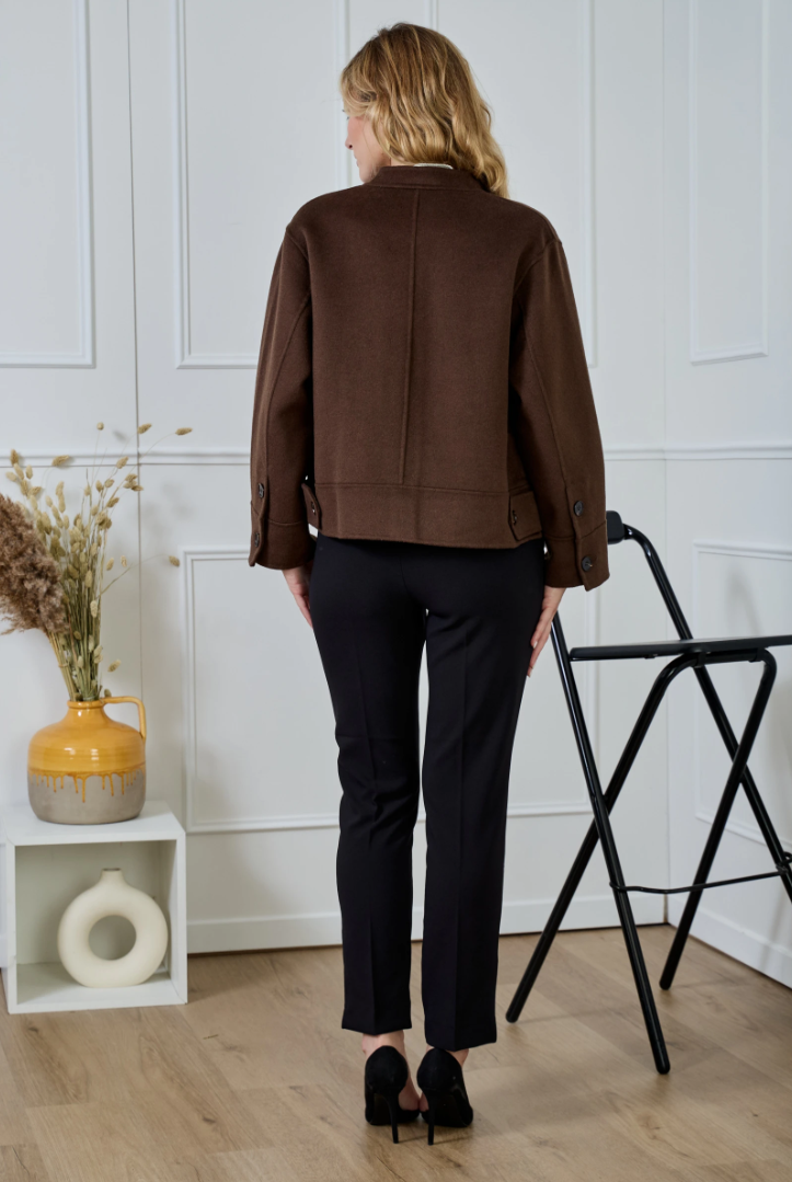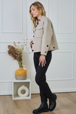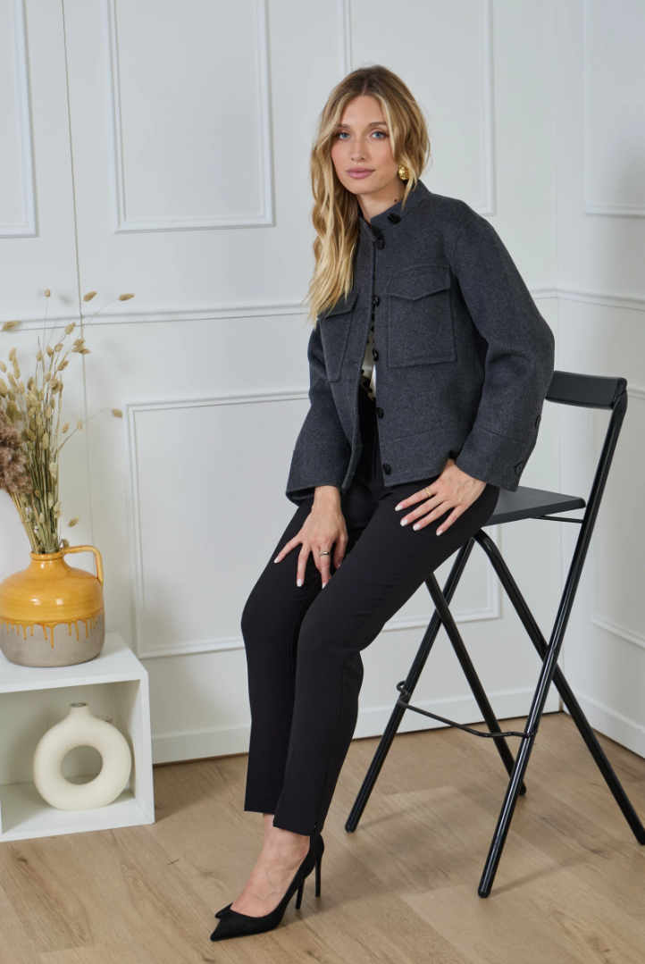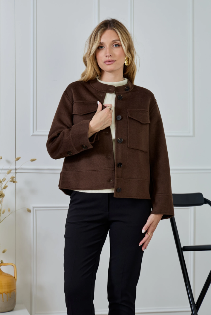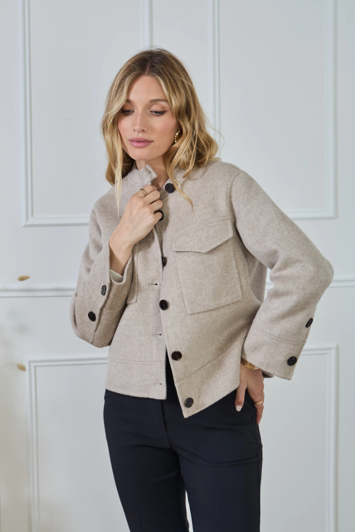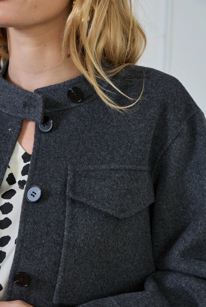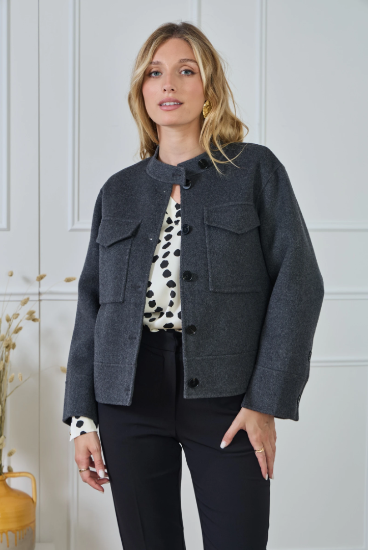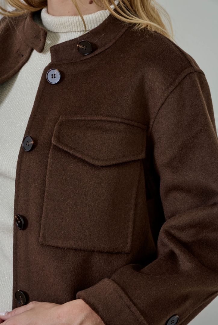 Short, boxy silhouette that hits at the hip for a modern, layered look.
