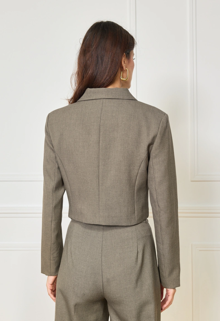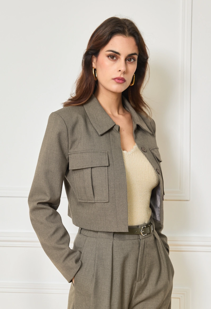 A modern cropped field jacket in supple suiting fabric with a subtle melange.