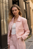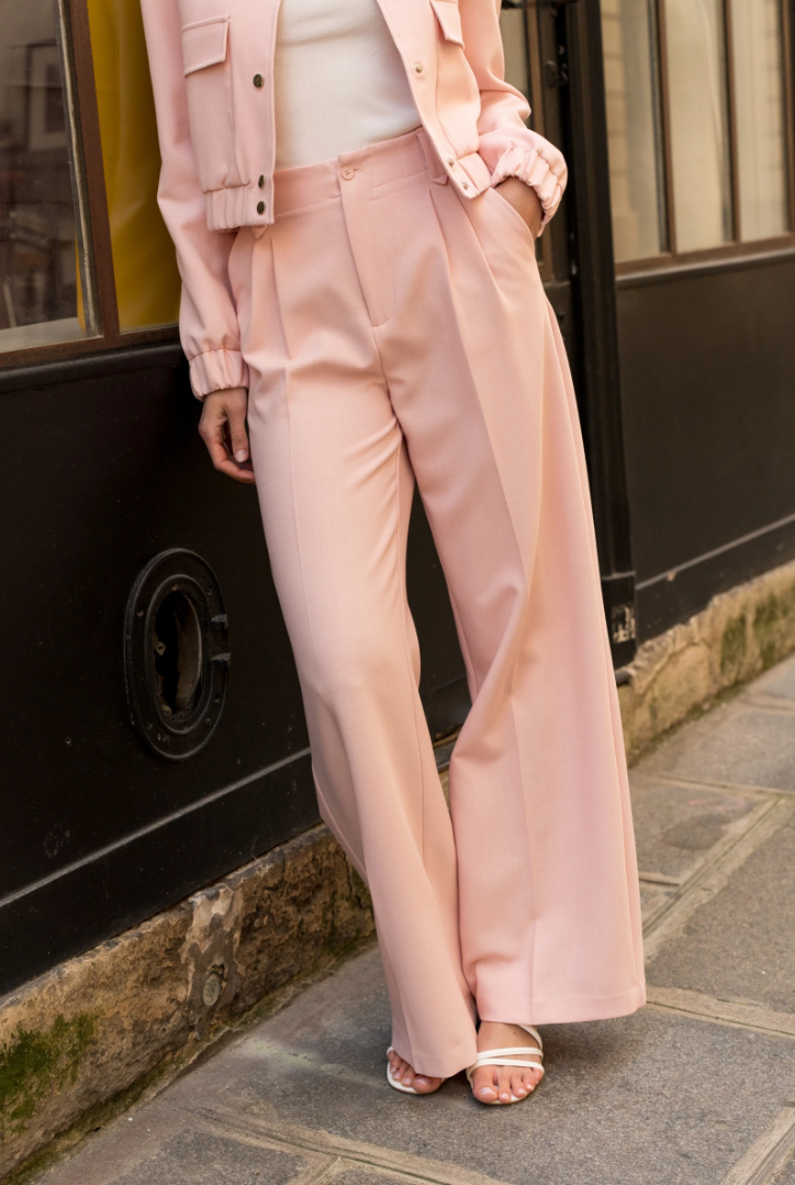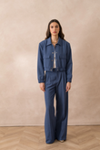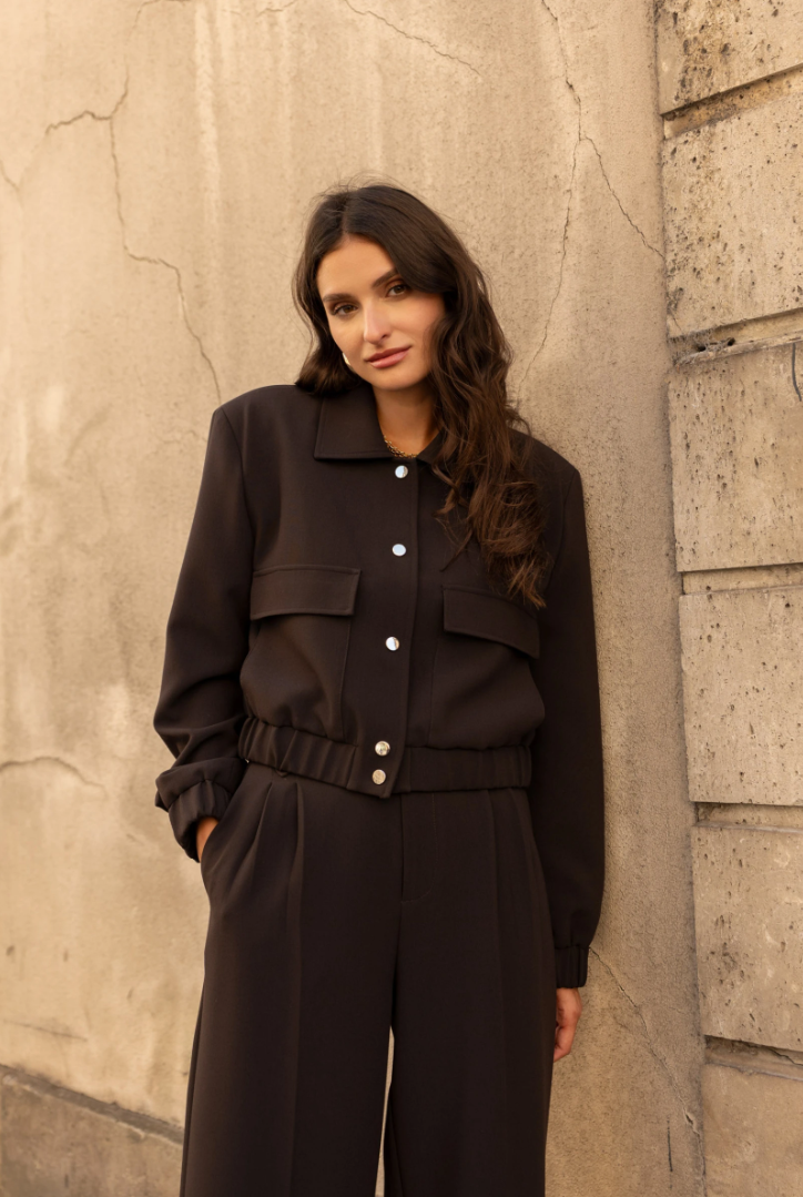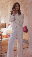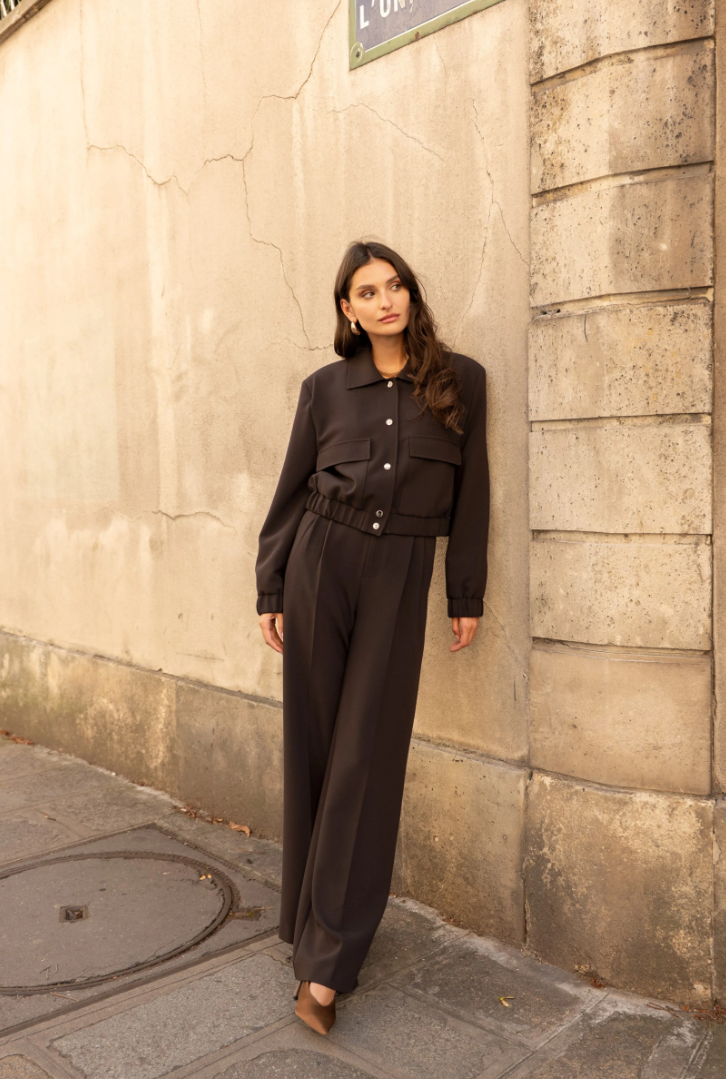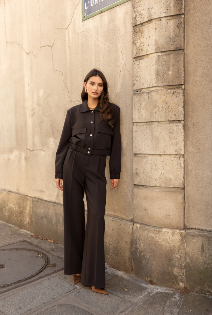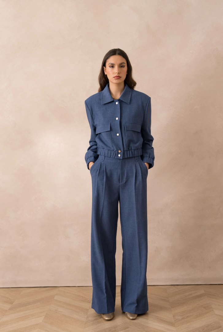 Heldere lijnen, relaxte tailoring. Cassiopea is een set met een kort jack en een hoge, wijdvallende broek: flatterend van ochtend tot avond.