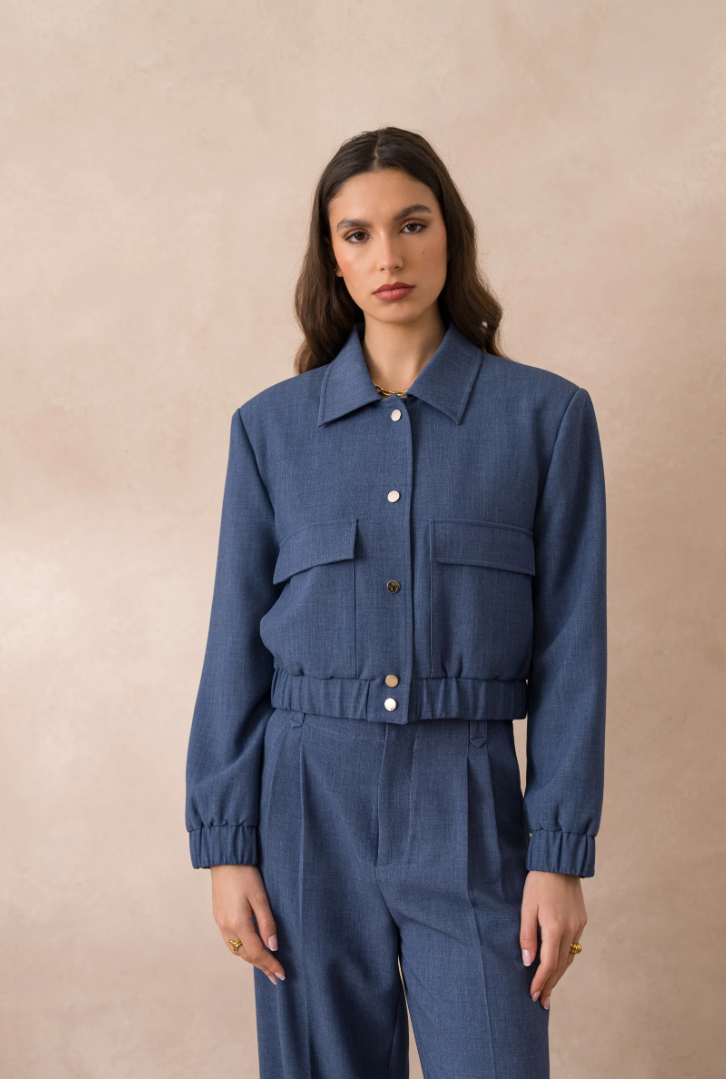 Jack: kort model met onzichtbare elastische taille, klassieke kraag, klepzakken en nette (druk)knopen.