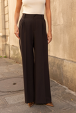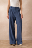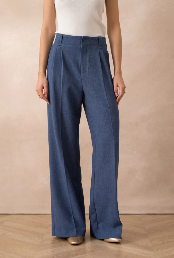 Broek: high-waist met frontplooien, geperste vouw over het been, steekzakken voor en paspelzakken achter; riemlussen aanwezig.