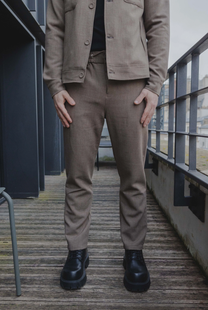 Stille luxe met Parijse nonchalance. Cers Rive Gauche is een tweedelige set—overhemdjack + pantalon—met strakke lijnen, cleane afwerking en een subtiele tortora-mélange die overal moeiteloos mee combineert. Draag ze samen voor een moderne city-suit, of los als slimme bouwstenen in je garderobe.