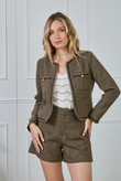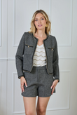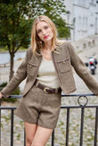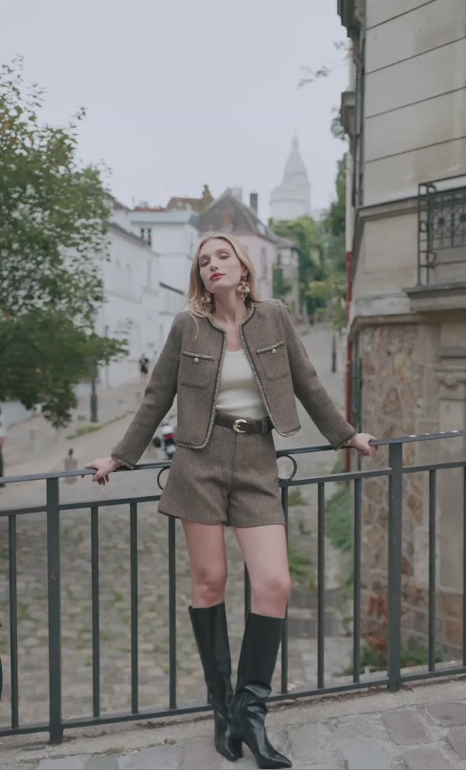 City-chic short in een rijke tweed-look met klassiek visgraat (spigato). Tijdloos, stevig maar soepel, en perfect met hoge laarzen of een compacte blazer voor een moderne herfst/winter set.