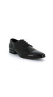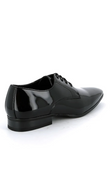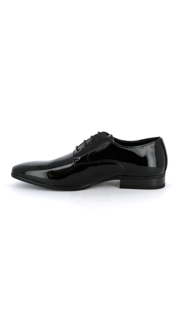 Een slanke derby in Italiaans lakleer Vernice Nero (zwart lak) met subtiele orlo-naad rond de neus. De amandel-/puntneus verlengt het silhouet, terwijl de lichtgewicht zool en zachte voering moeiteloos comfort bieden—van borrel tot black-tie.