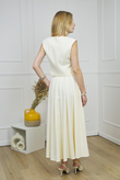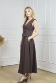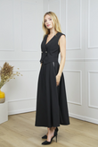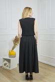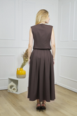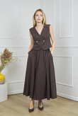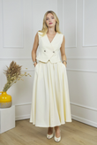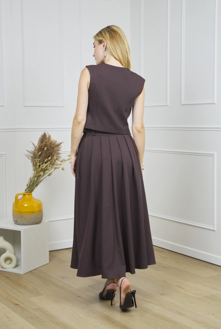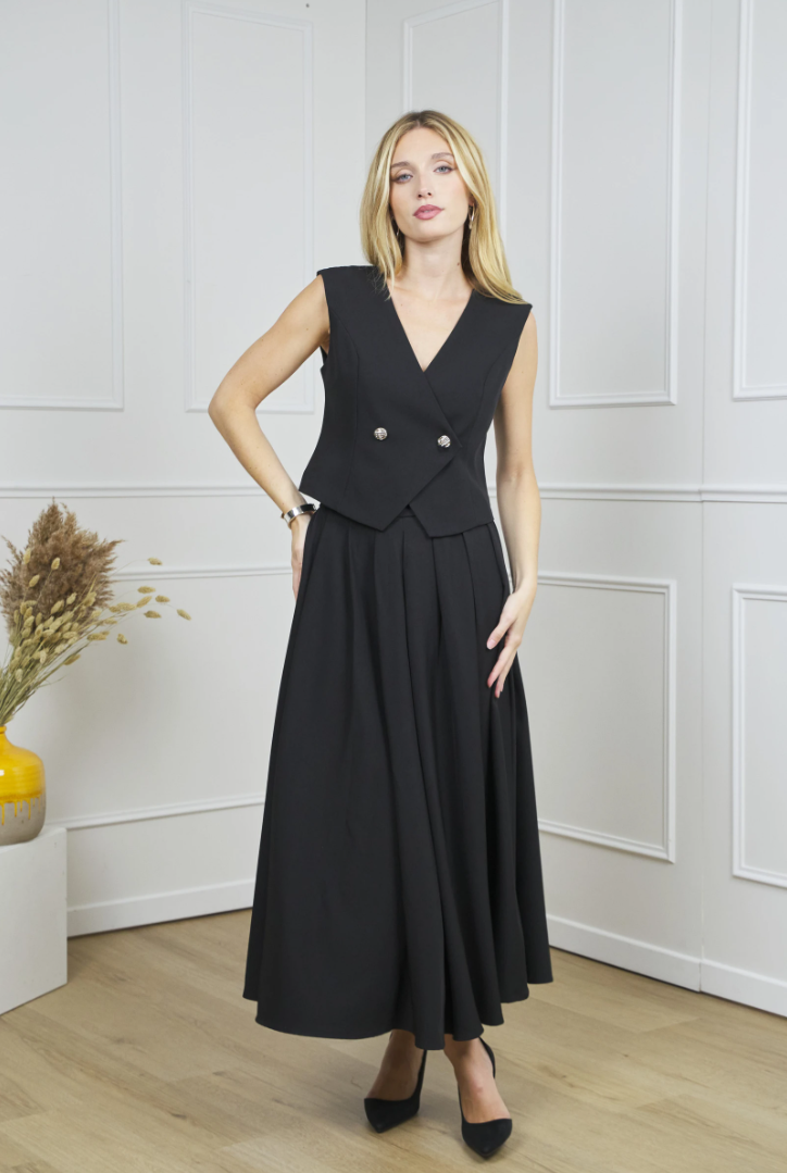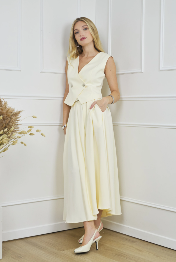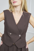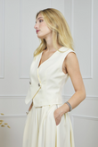 Italiaanse tailoring, nuchter chic. La Scala Vest is een mouwloos, licht getailleerd gilet met diepe V-hals en elegante overslag die sluit met twee sierknopen. De gecroppte lengte eindigt precies in de taille; de puntige voorzoom geeft een grafische, vrouwelijke lijn. Gemaakt van een lichte suiting met een vleugje stretch: vormvast, comfortabel en kreukarm—van kantoor tot avond.