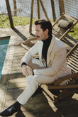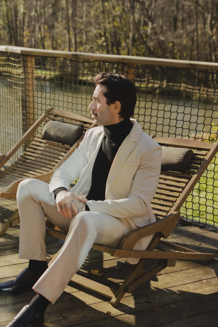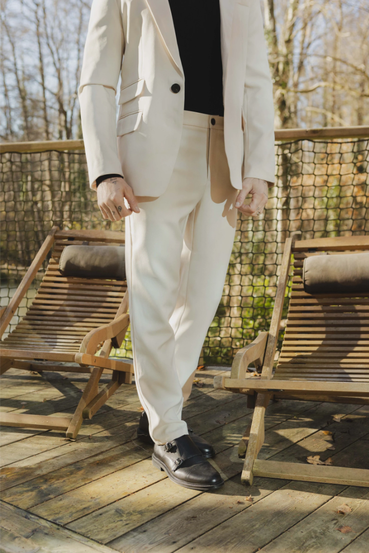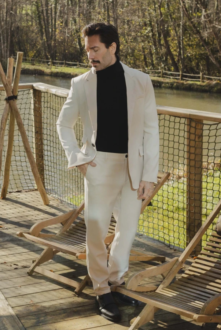Minimalistisch ivoor met een scherp zwart accent. Deze set combineert een écru tailored suit met een zwarte coltrui voor een look die tegelijk modern, warm en onberispelijk chic is.
