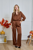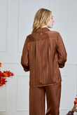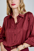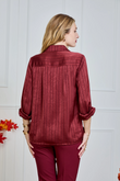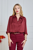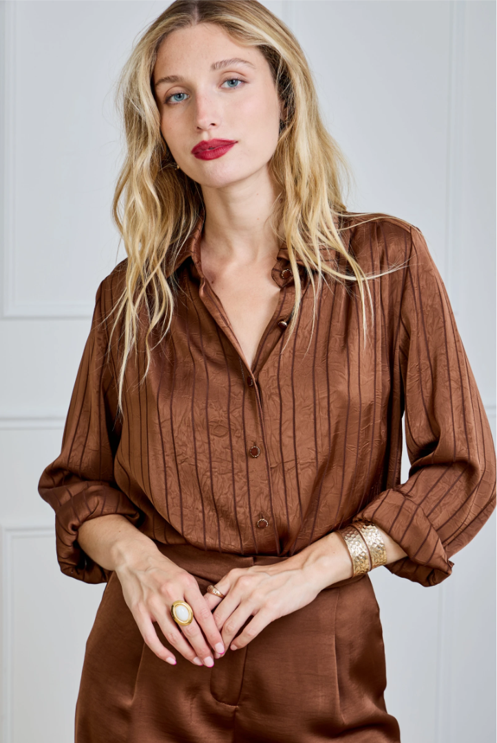 Glanzende blouse met subtiele, ingeweven strepen en een luxueuze satijn-look. Valt soepel, voelt licht aan en geeft elke look direct iets verfijnds – van kantoor tot avond.