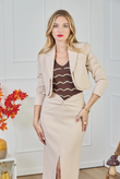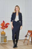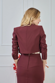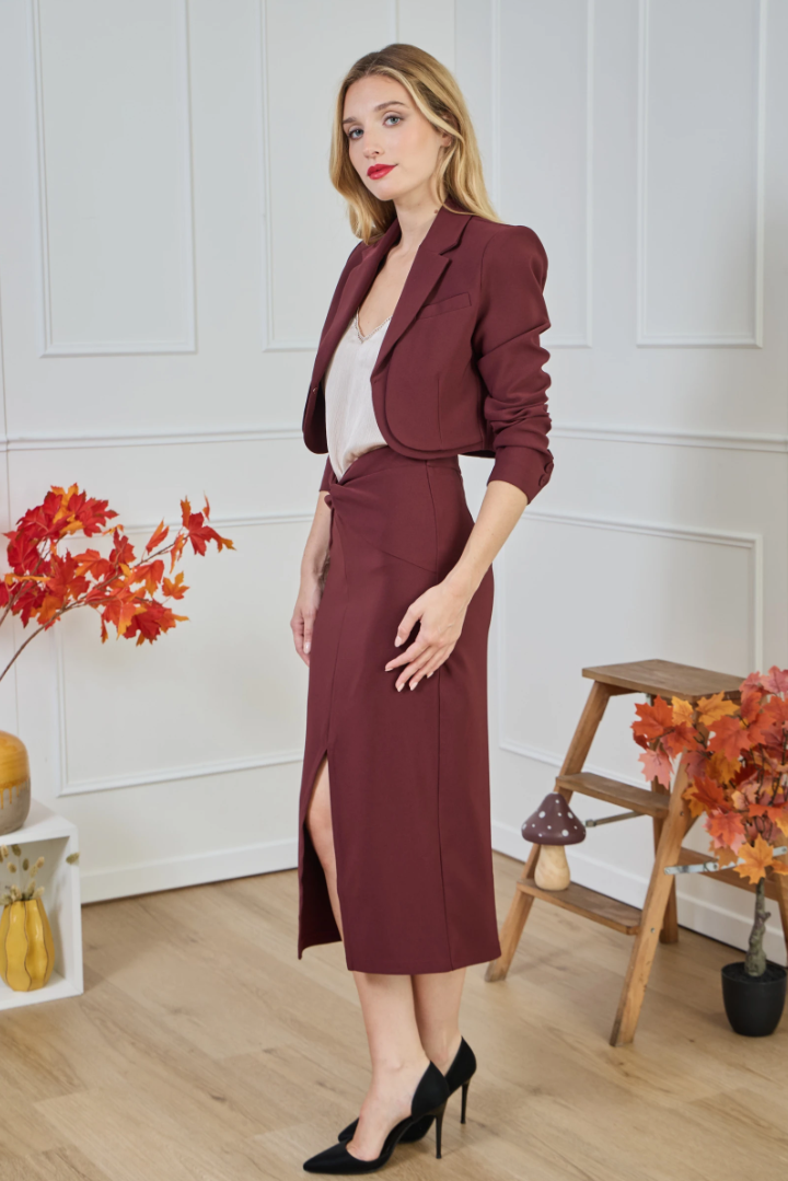 Een modern, cropped colbert met afgeronde cutaway-voorpanden dat precies op de taille eindigt. Het scherpe schouderwerk en de slanke mouwen geven structuur, terwijl de zachte lijn elegant over de Nodo-knoop van de rok valt. Gemaakt van compacte, soepel vallende suiting met lichte stretch voor vormbehoud en comfort—ideaal solo of als co-ord met de Nodo Royale Rok.