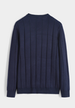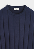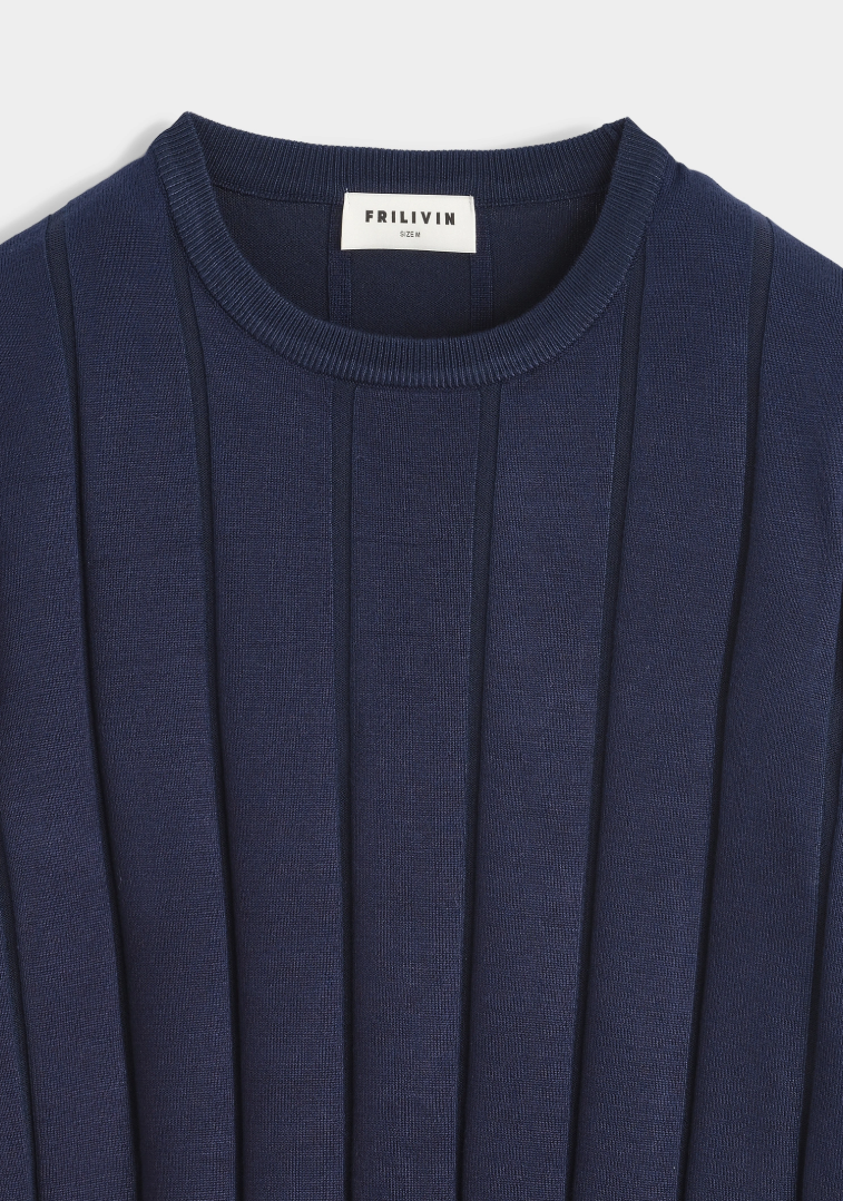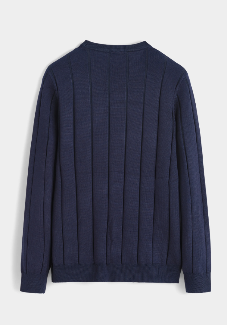 Diep marineblauw, strak en tijdloos. Deze trui valt op door brede, verticale ribstructuur die lengte geeft en een subtiel 3D-effect creëert.