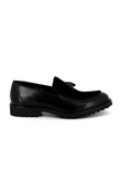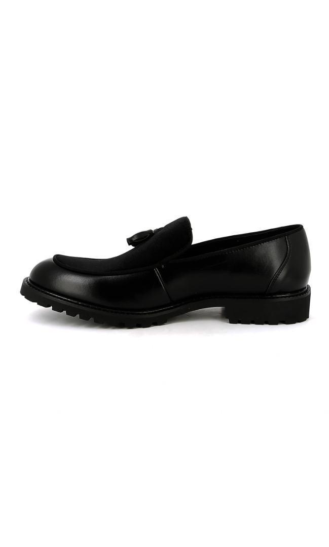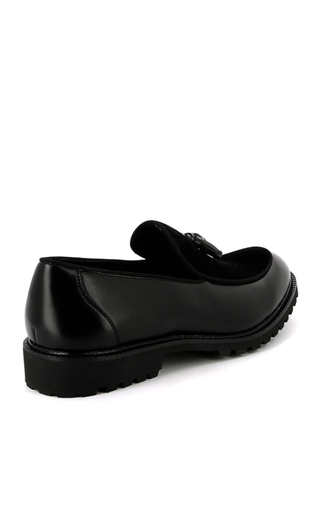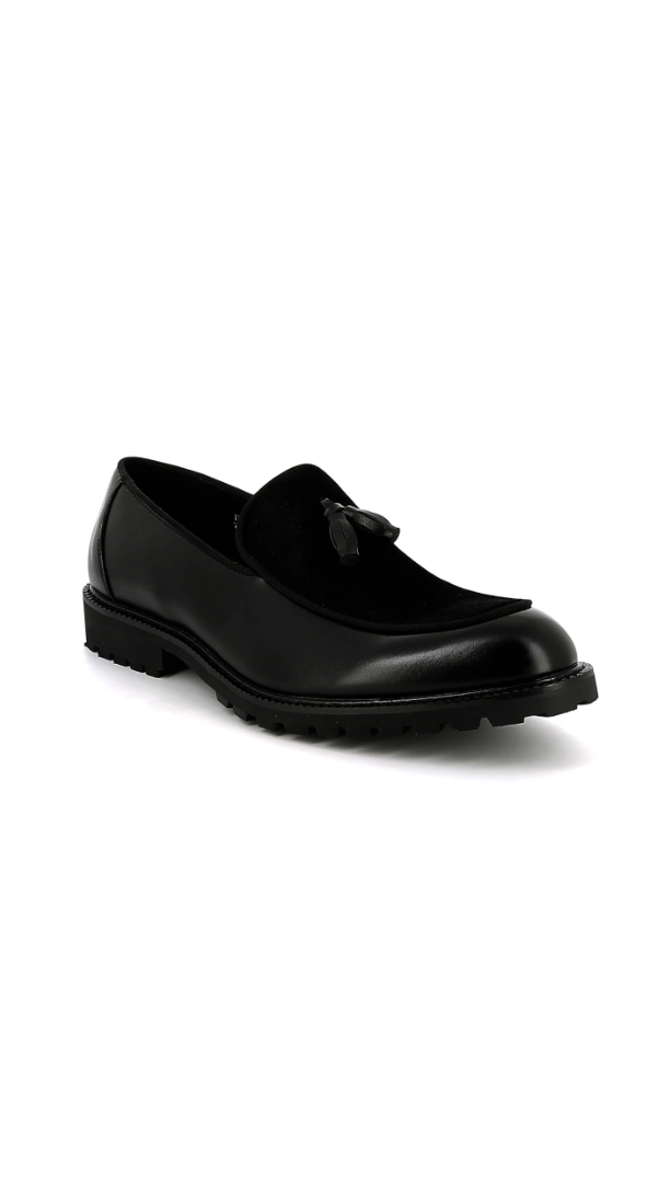 Vamp: velvet-textuur • Zijkanten & hiel: gepolijst leer • Zool: rubber met grof profiel • Sluiting: instapper met dubbele tassel.
