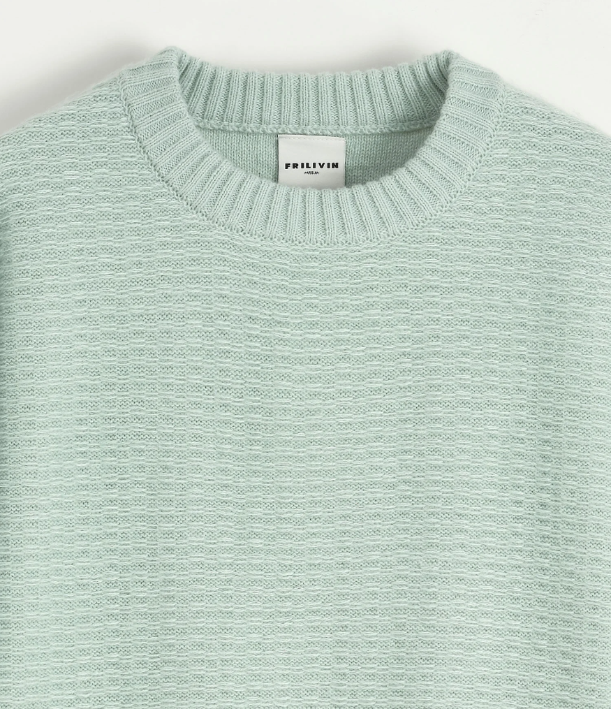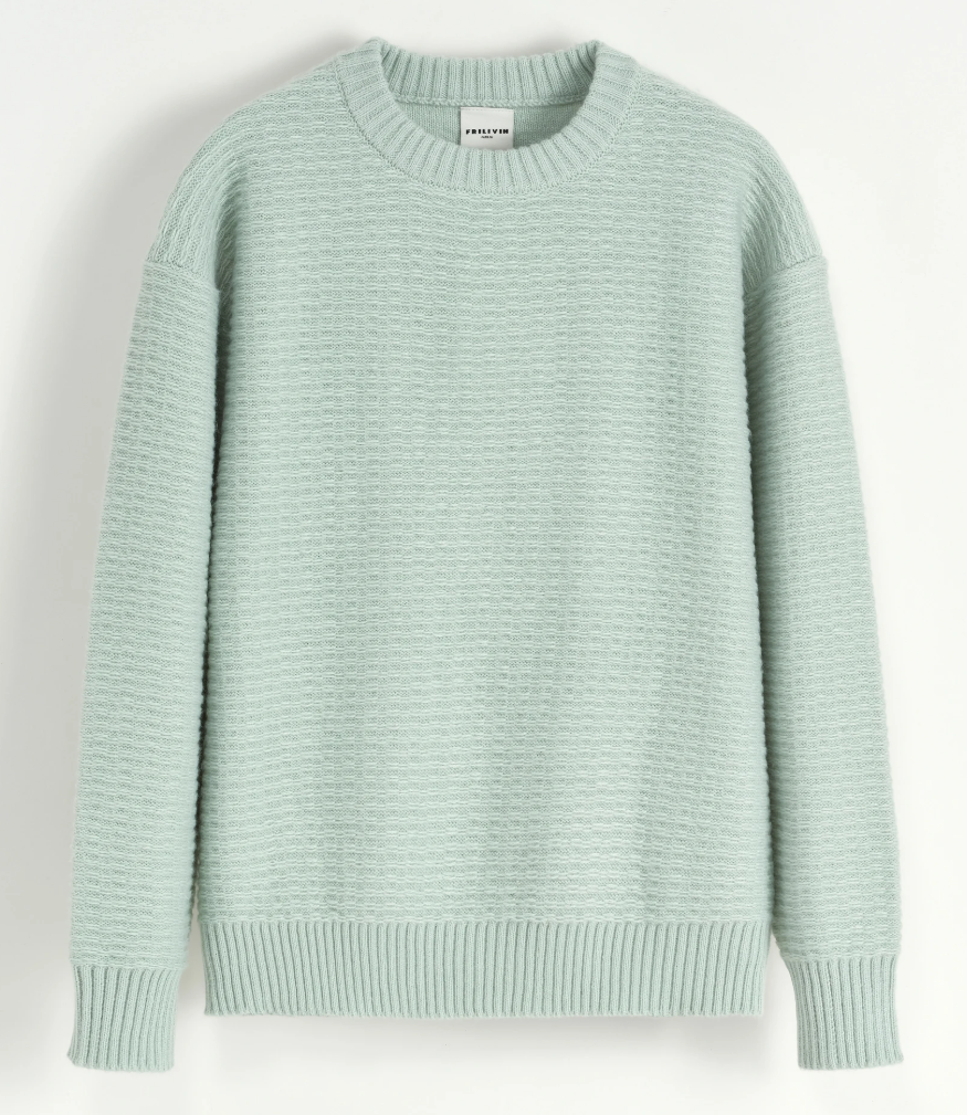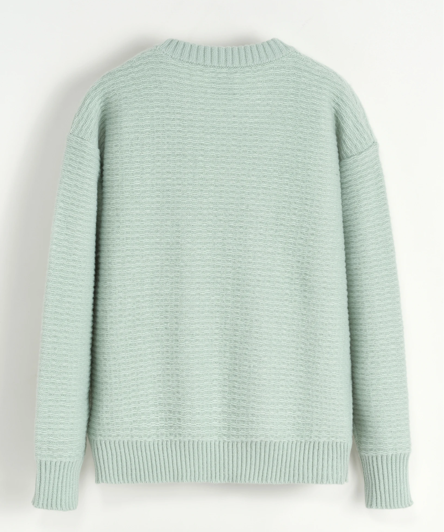 Een gestructureerde herfsttrui in een rustige groentint — licht, ademend en uitzonderlijk zacht aanvoelend.