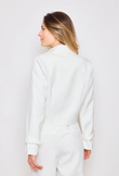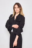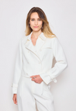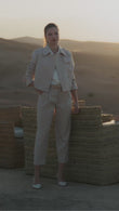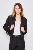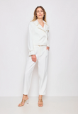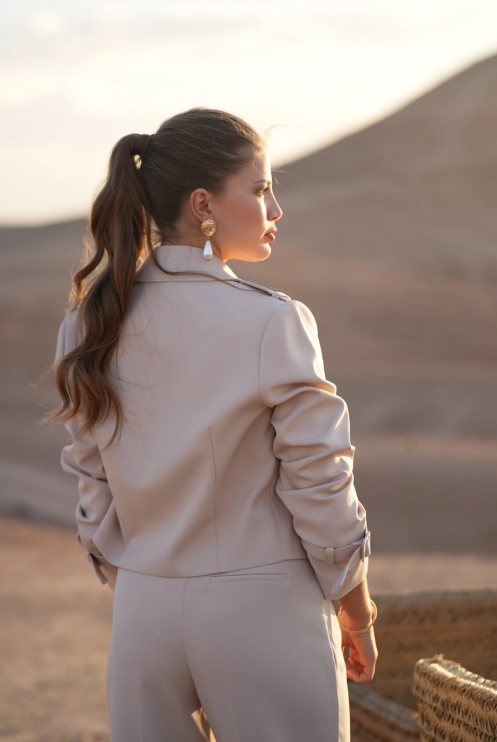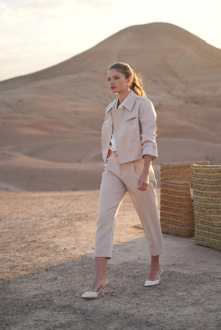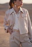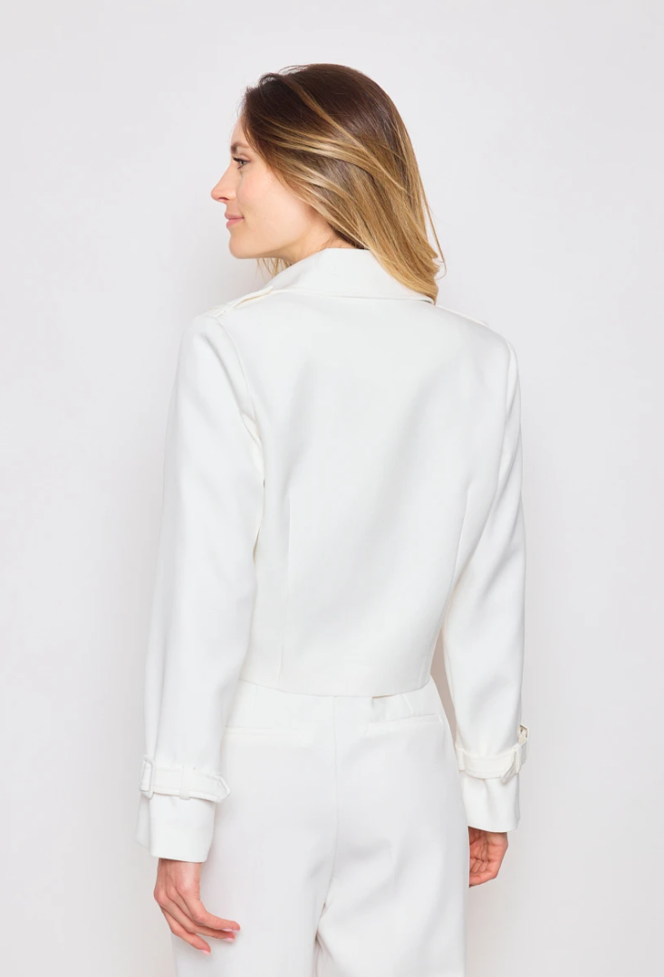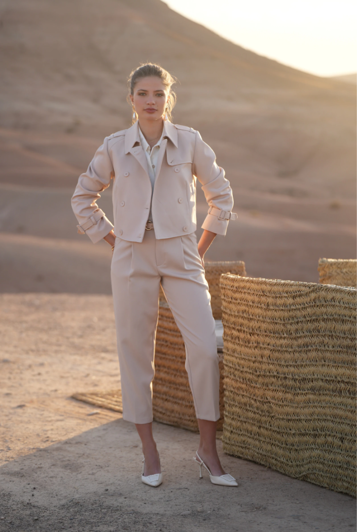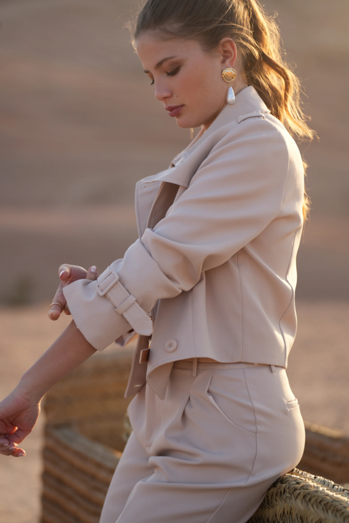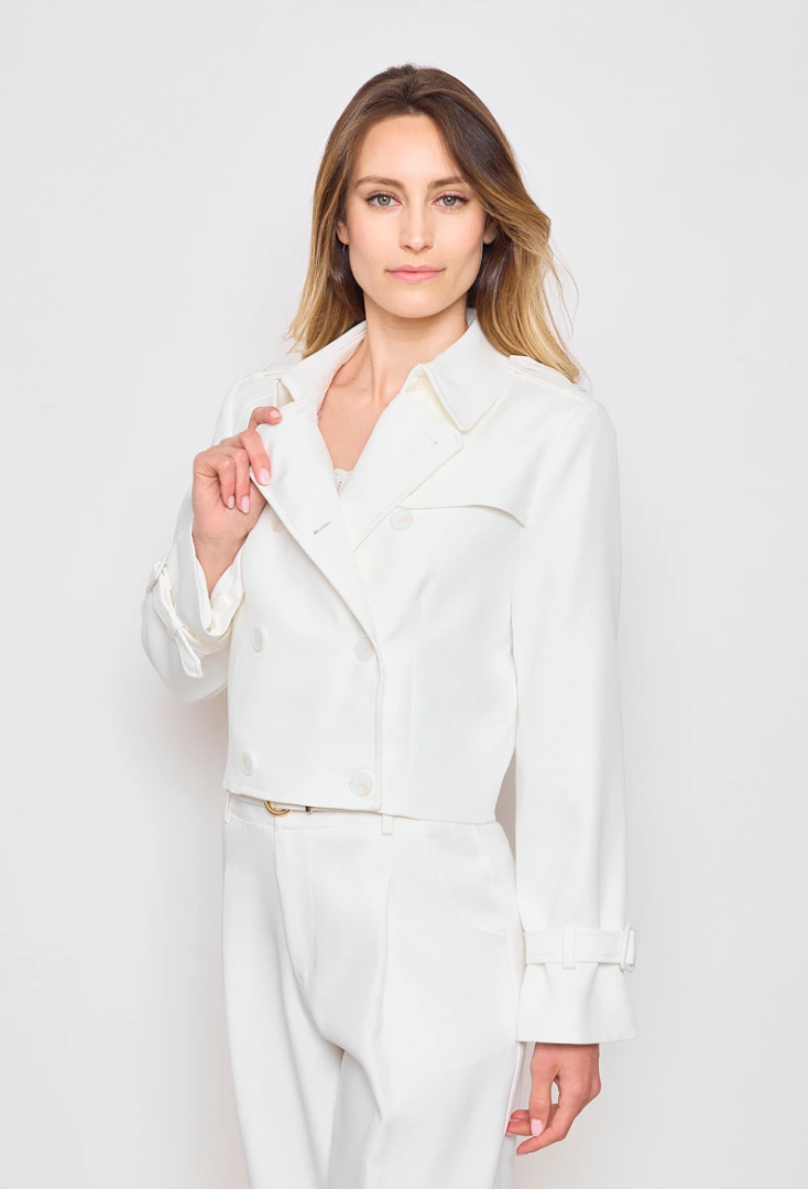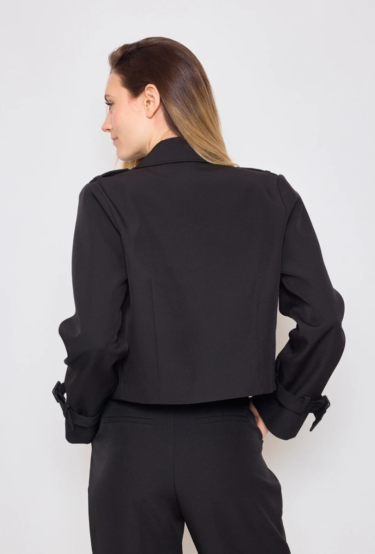 Een cropped trench-geïnspireerde blazer met dubbelrijige voorkant, spitse revers, epauletten en verstelbare manchetbanden. De rechte, kortere snit accentueert de taille en valt strak maar soepel dankzij de compacte, kreukvriendelijke suiting. Een veelzijdig statementstuk—van kantoor tot avond—solo of als co-ord met de bijpassende broek.