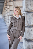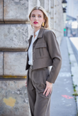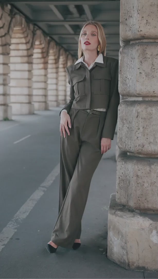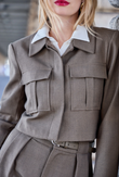 Een moderne, cropped field-jacket in soepele pakstof met subtiele melange. Talpa (koel taupe/grijzebruin) geeft een zachte, verfijnde uitstraling, terwijl de scherpe kraag en vier klepzakken met boxplooi structuur en balans brengen. Afgewerkt met ton-sur-ton knopen voor een cleane, gepolijste look—van kantoor tot weekend, moeiteloos te stylen met high-rise broeken of rokken.
